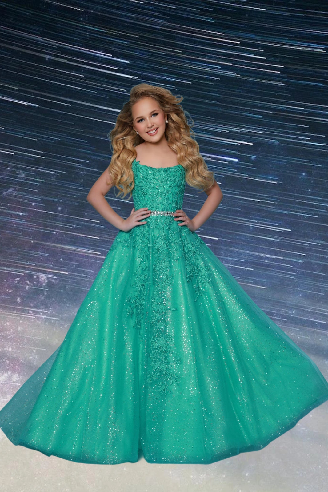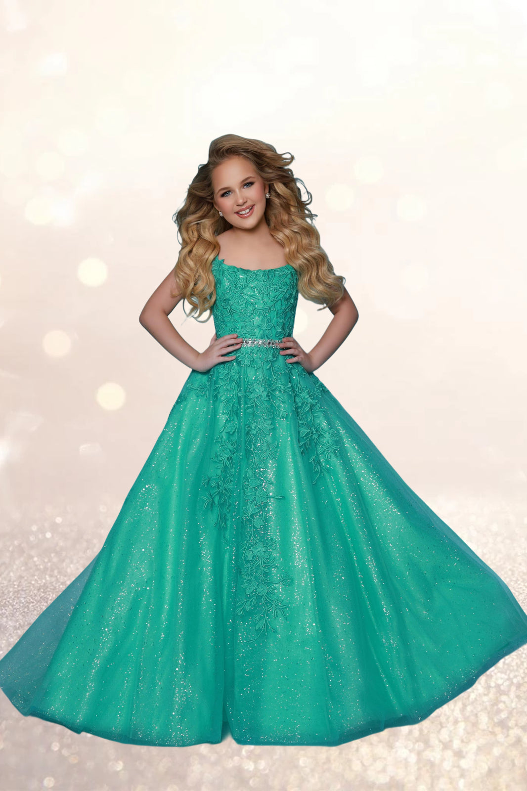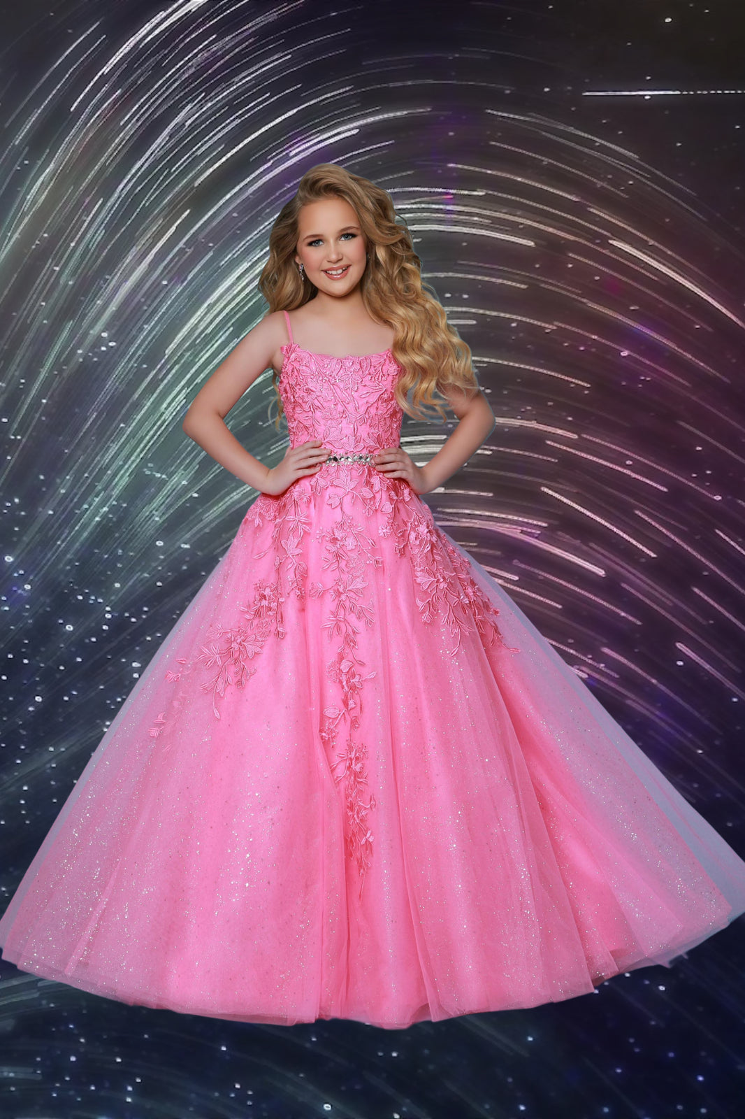 Make her special day unforgettable with the Clarissa gown by 2Cute, a stunning pageant dress in hot pink, orange, or mint green. This full-length ballgown features a shimmering glitter tulle overlay and intricate 3D floral appliqué cascading down the skirt and bodice. Thin straps and a sparkling waistline add the perfect touch of elegance, making it ideal for birthdays, pageants, portraits, and father-daughter dances. She’ll feel like a princess in this show-stopping design.
