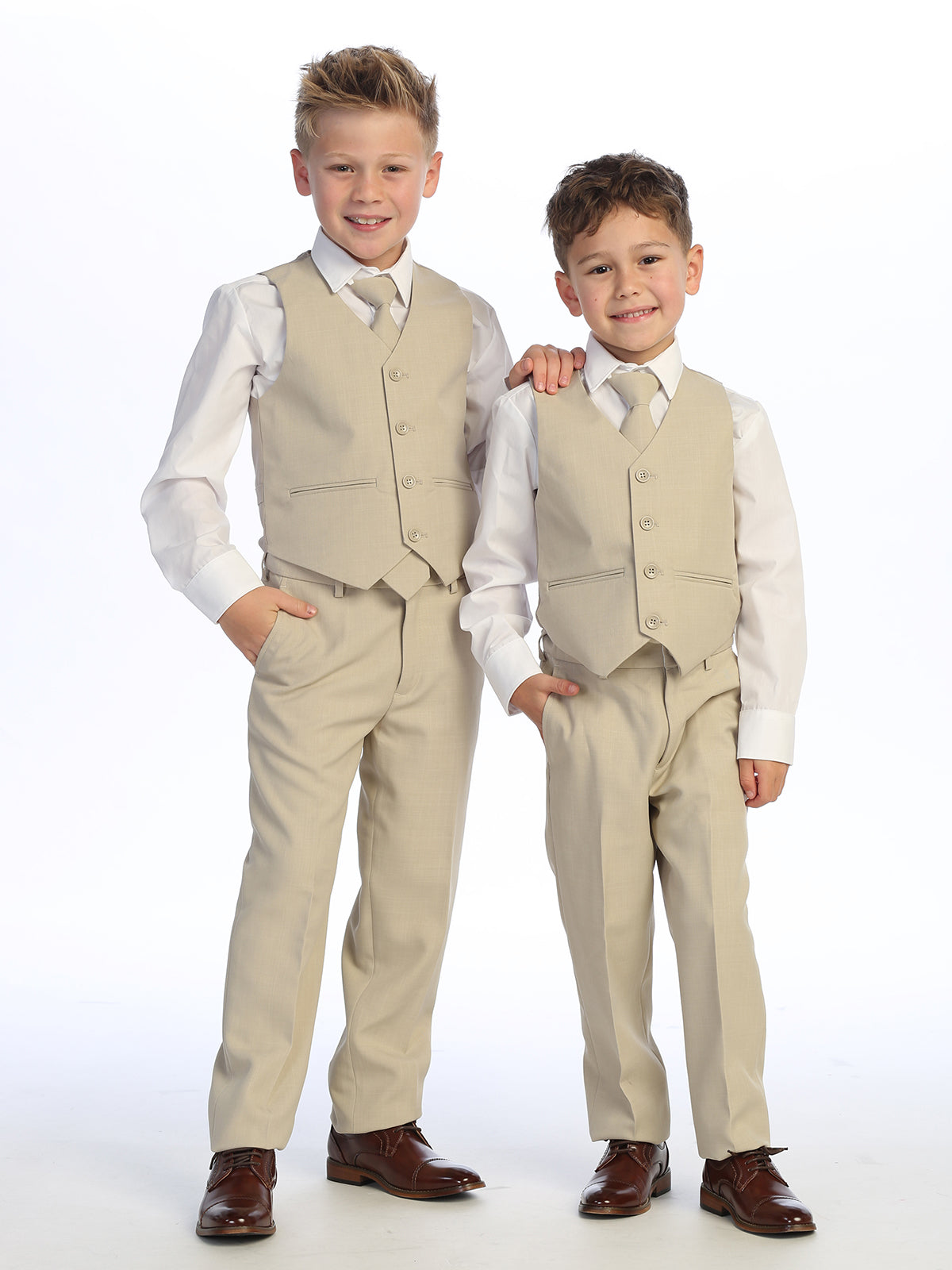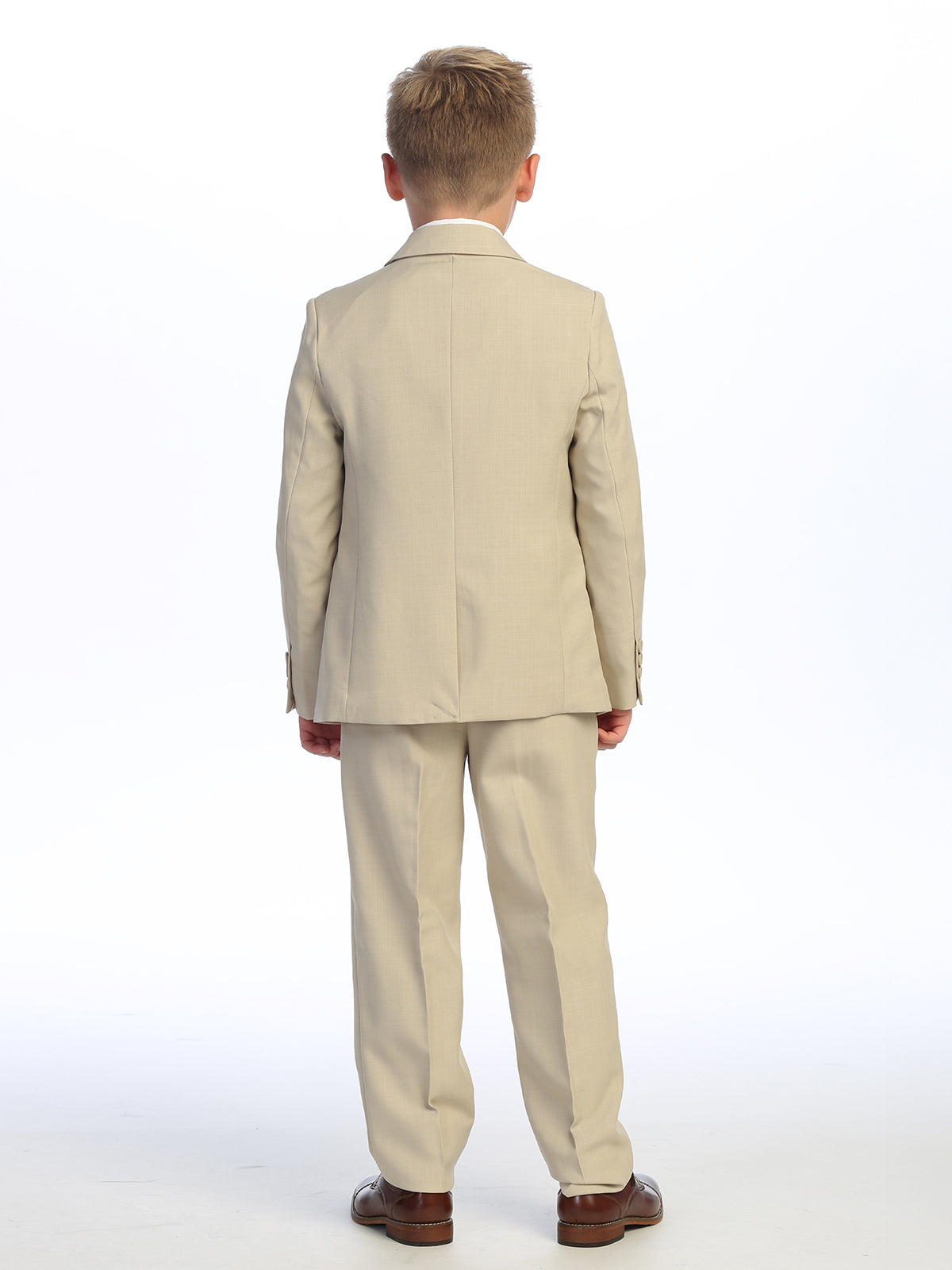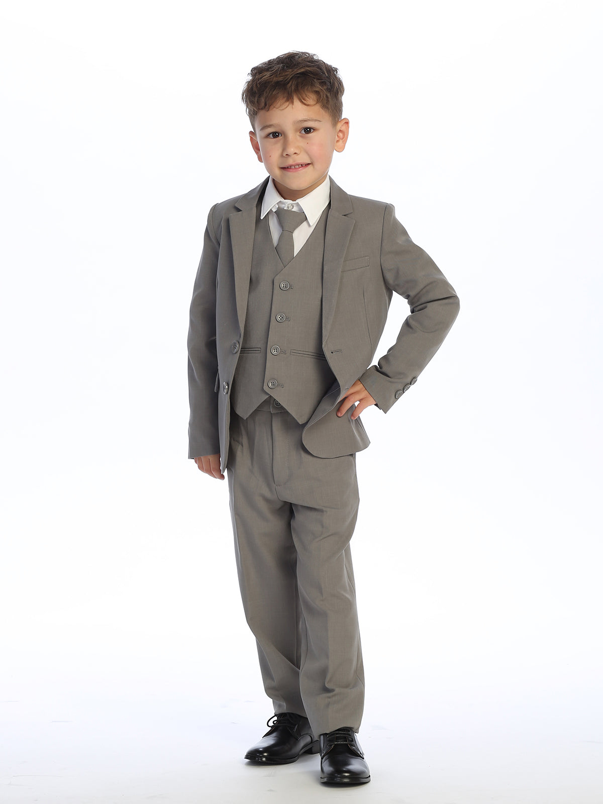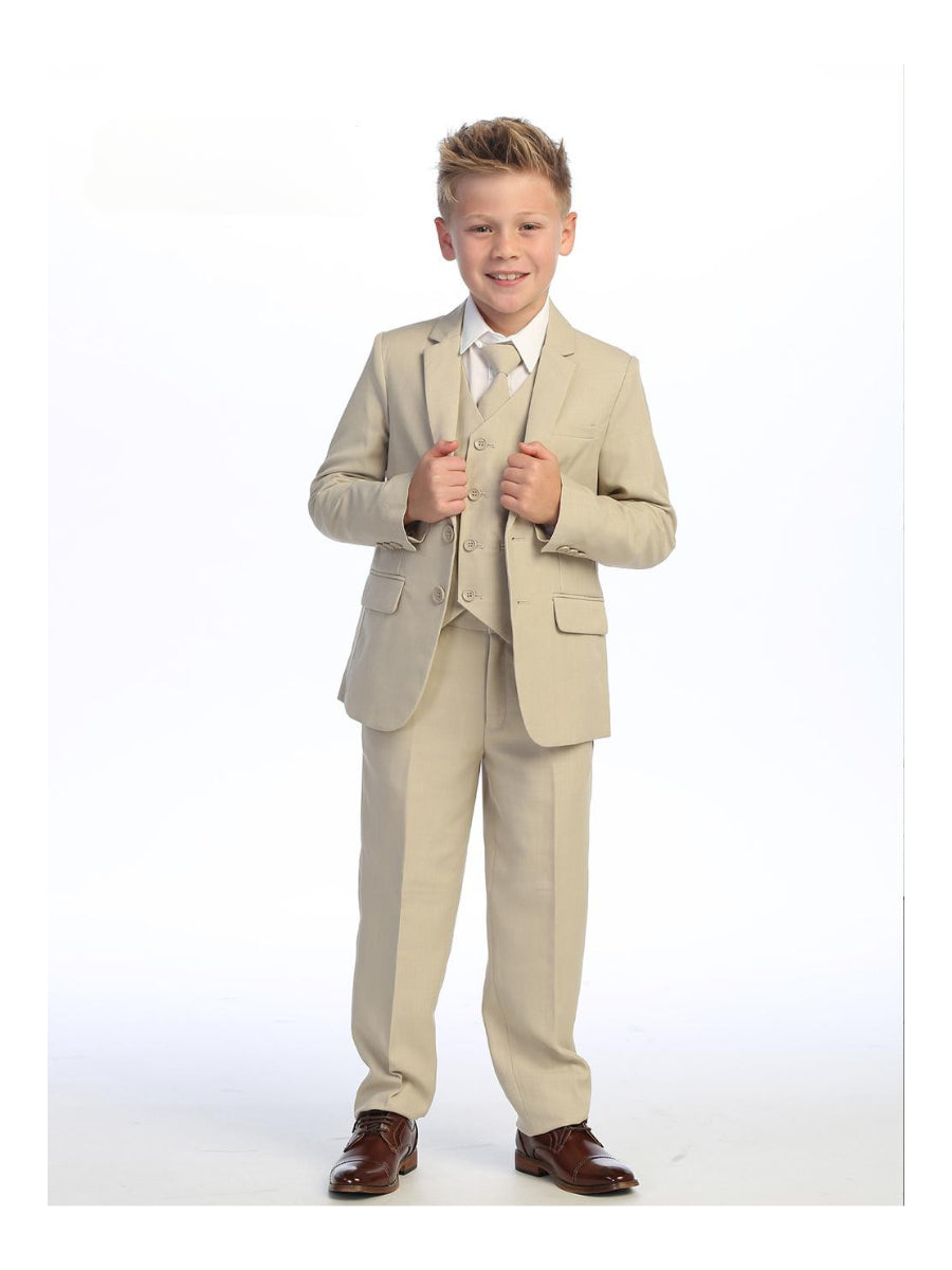 Dress him in timeless sophistication with this 5-piece boys' suit, perfect for weddings, communions, and formal occasions. This impeccably tailored ensemble includes a sharp jacket, vest, trousers, crisp white dress shirt, and coordinating tie, ensuring a polished look. Designed for both comfort and elegance, this suit is crafted from high-quality fabric for a refined fit. Available in Dark Gray, Khaki, Light Gray, and Navy Blue, with husky sizes ranging from 8 to 22, making it easy to find the perfect fit for any young gentleman. Whether he’s walking down the aisle or attending a special event, this suit guarantees a dapper appearance with effortless style.