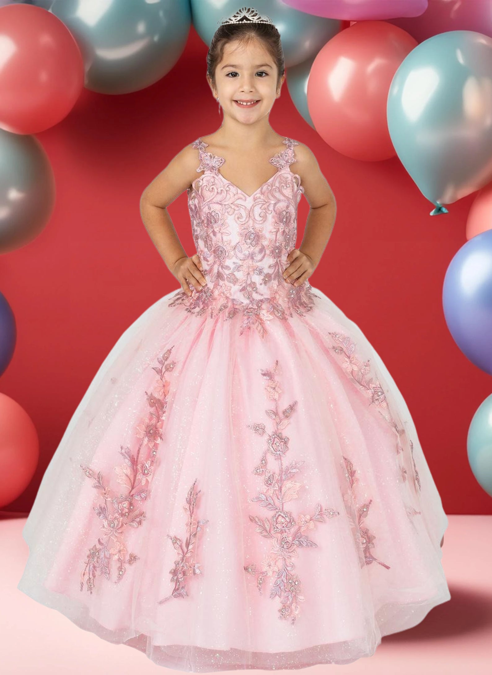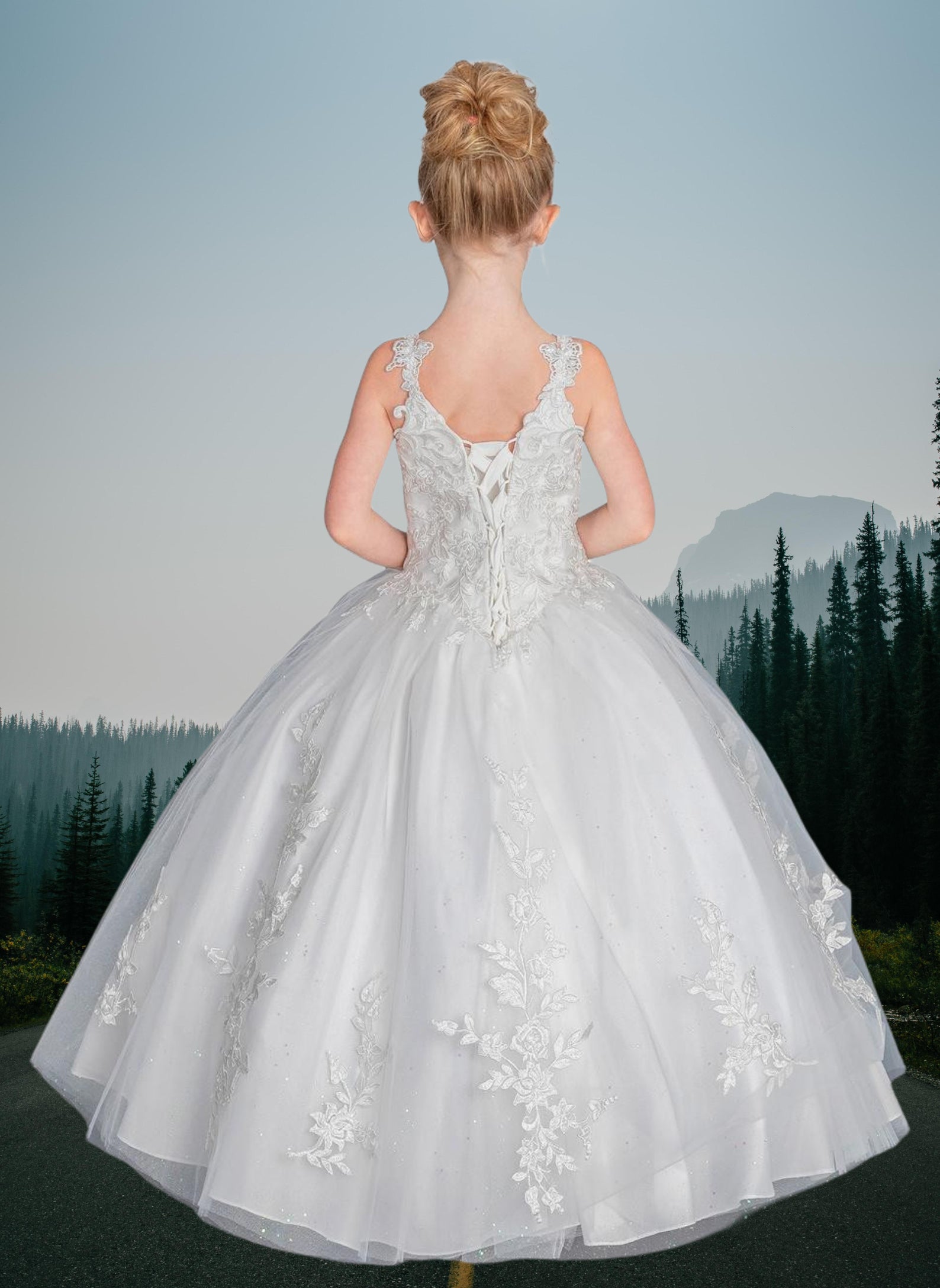 The Colette Dream Gown brings a magical fairytale touch to every special moment. Designed with a beautifully embroidered lace bodice, lace-up back, and delicate shoulder straps, this gown cascades into a voluminous tulle skirt adorned with shimmering floral appliqué. Available in Bahama blue, blush, lilac, and off-white, it's the perfect choice for pageants, birthdays, flower girl duties, and grand celebrations.
