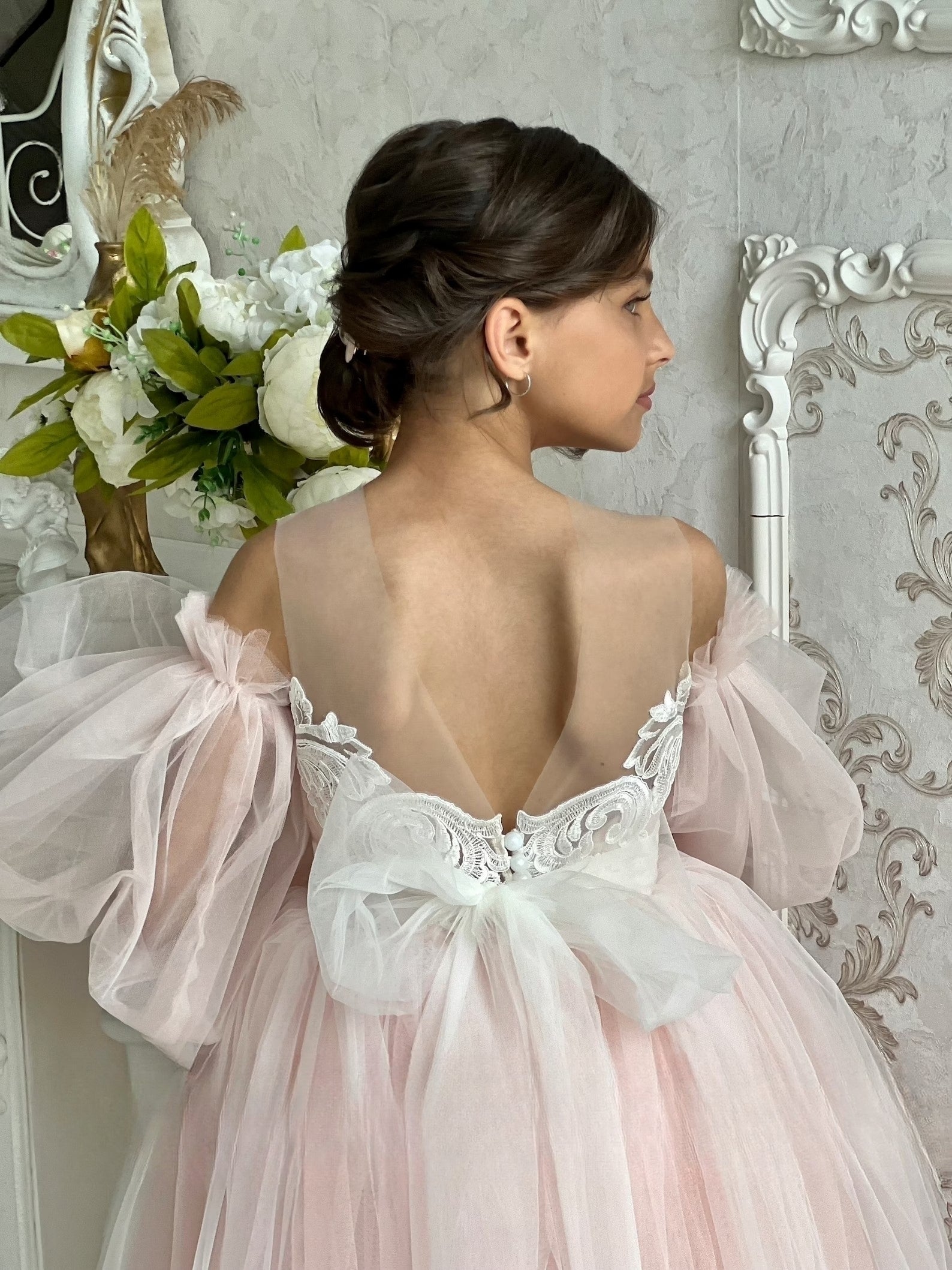 The Elora Flower Girl Satin Tulle Dress from Blush Kids is the epitome of elegance and grace designed for special occasions. Its satin lace embellished bodice, adorned with intricate details, perfectly complements the sheer neckline, adding a touch of sophistication and charm. Unique to this exquisite piece are the detachable sheer sleeves that offer versatility and style, catering to different preferences and seasons. The deep V neckline at the back, coupled with an oversized bow accent, adds an element of surprise and whimsy, ensuring the wearer stands out with every turn. Finally, the dress's beauty is accentuated by a floor-length layered tulle skirt, creating a flowing, ethereal look that is sure to capture the hearts of all who behold it.