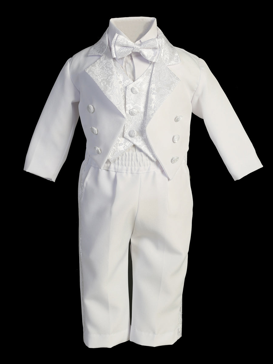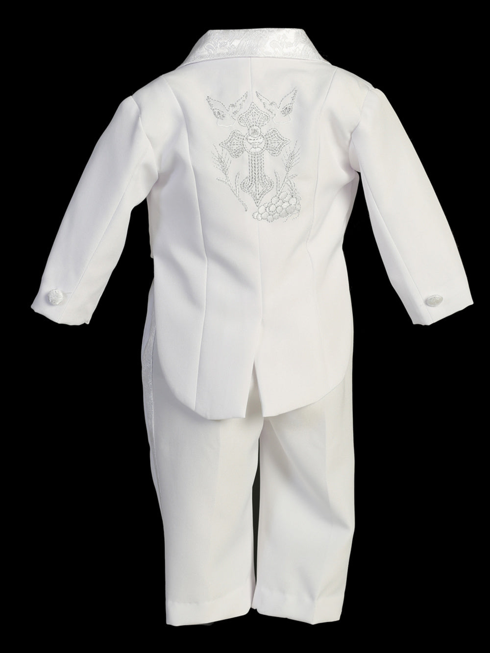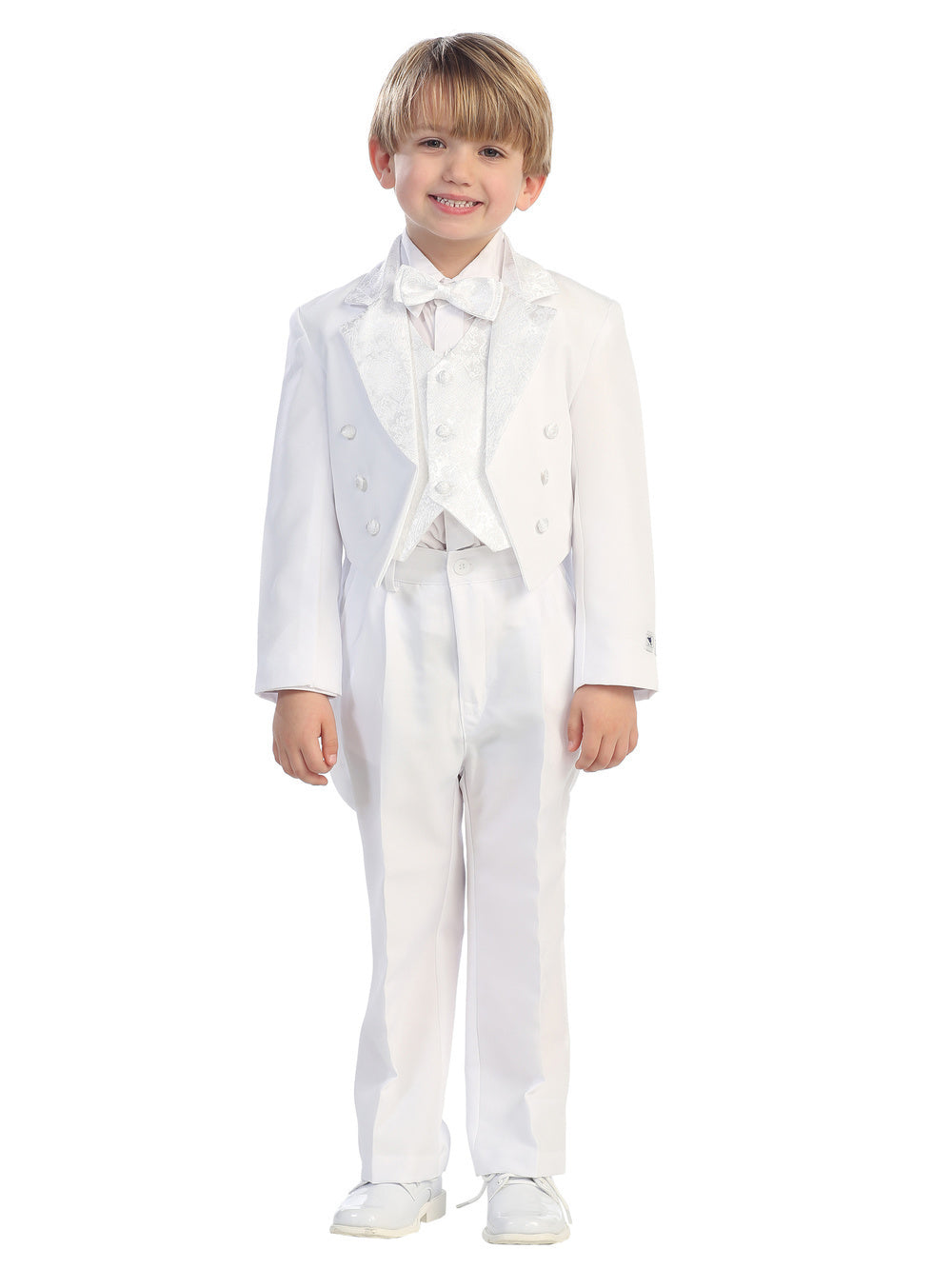 The Cristiano Sacred Tuxedo blends classic formality with meaningful detail, making it a perfect choice for sacred and special occasions. This elegant 5-piece ensemble includes a white jacket with satin-trimmed lapel, pleated shirt, trousers, bow tie, and cummerbund. The standout feature is the religious embroidery on the back, available in Angel Silver, Cross, Maria Silver, or Pope Silver designs—each crafted to symbolize faith, grace, and devotion. An ideal outfit for First Communion, weddings, christenings, church ceremonies, or formal portraits, the Cristiano suit ensures a polished, reverent look. Available in a full range of toddler to youth sizes.