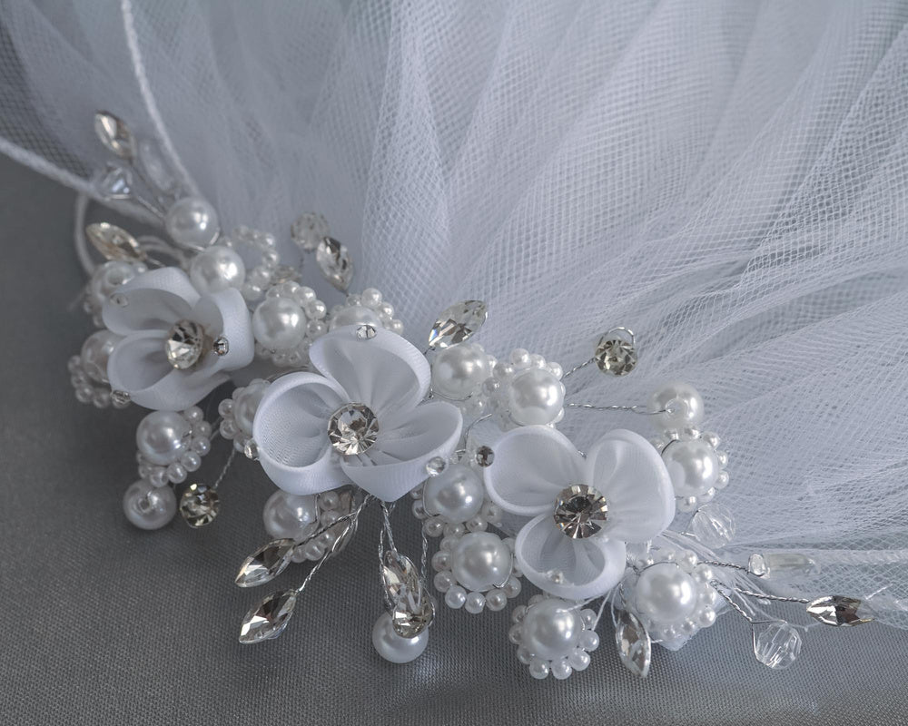 Elevate her special day look with this stunning Crystal 24" Veil on comb, adorned with delicate organza flowers, sparkling rhinestones, elegant pearls, and crystals. Perfect for first communion or any formal occasion, this handcrafted veil adds a radiant charm to her ensemble.