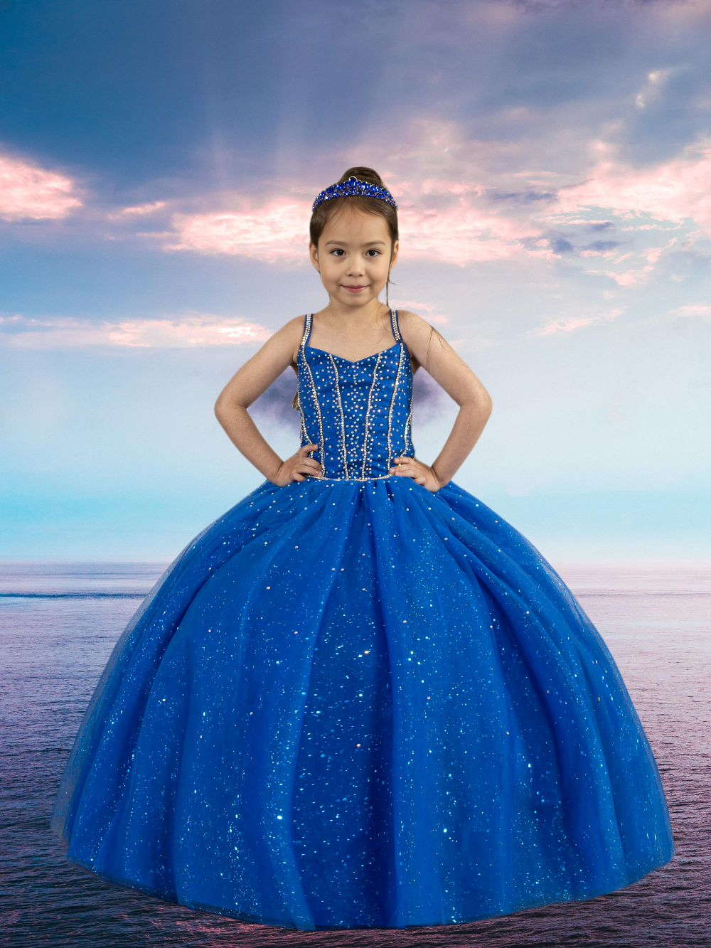 From our enchanting Princess Collection, the Danica gown is made for show-stopping entrances. This royal blue girls’ pageant dress features a glitter tulle ballgown skirt that catches every light and movement. The corset-style bodice is adorned with shimmering rhinestones and finished with a lace-up back for an elegant silhouette. Lightweight spaghetti straps add a delicate touch. Perfect for pageants, birthdays, or father-daughter dances.