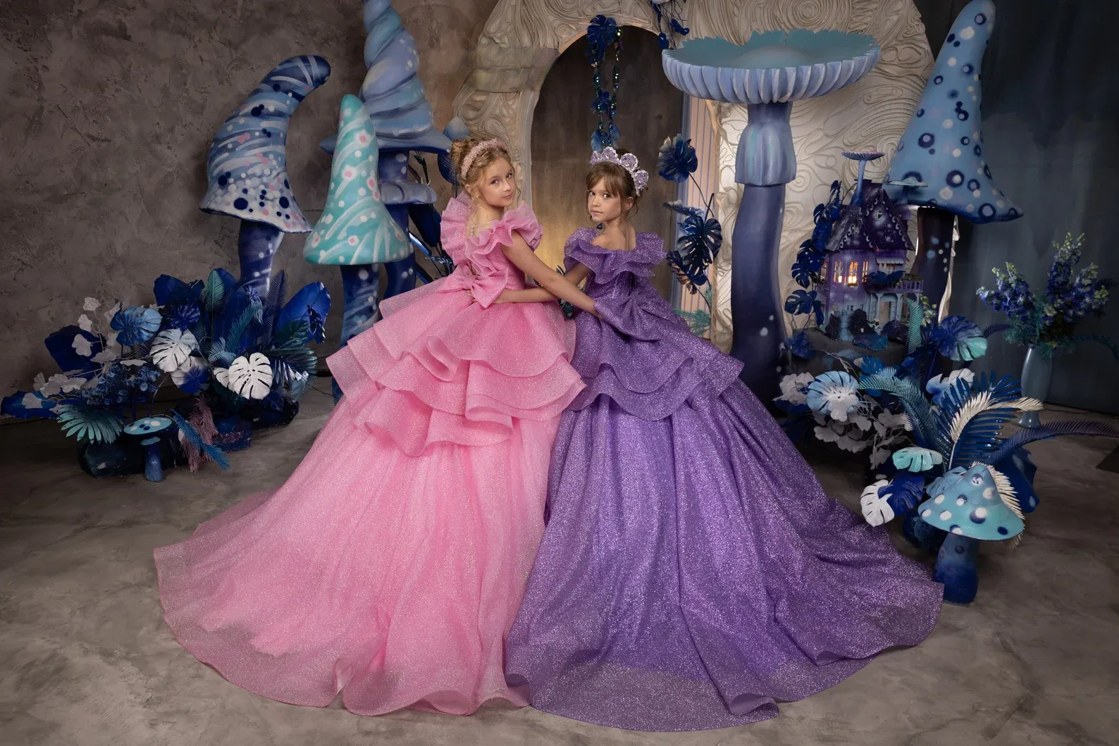 Introducing the Lainey Girls Couture Special Occasion Ball Gown, a dreamy baby pink flower girl dress fit for a princess! This enchanting gown features a multilayered glitter skirt with a charming train that will make any little girl feel like royalty. The corset bodice is adorned with delicate buttons and showcases a stunning ruffled V neckline that adds a touch of elegance. The tiered ruffles on top of the skirt create a whimsical and ethereal look, while the bow accent in the back adds a sweet and romantic touch. But the magic doesn't stop there!