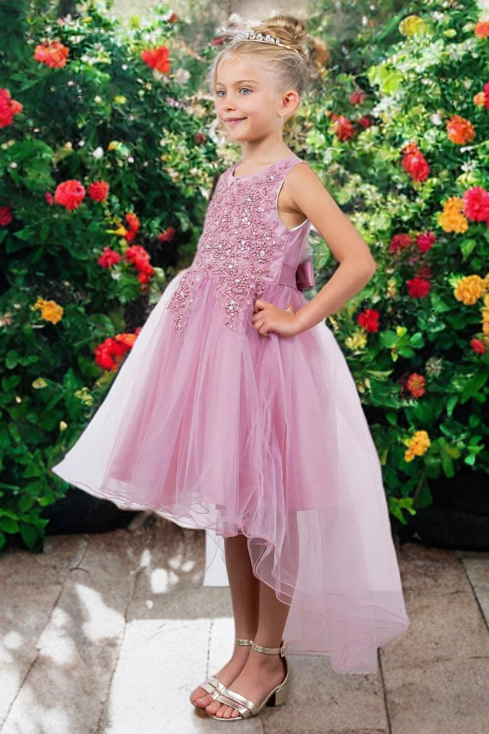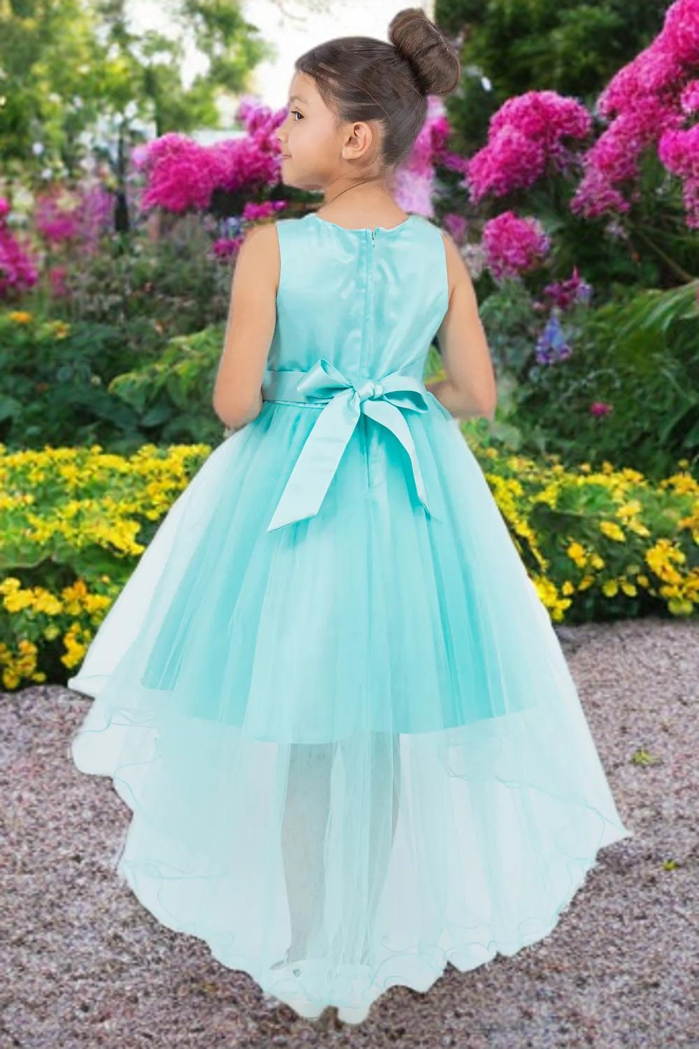 Let your little one shine in the Lina dress—an enchanting aqua high-low gown from the Blush Collection. Designed with a sleeveless bodice richly adorned in shimmering floral lace and delicate beadwork, this dress flows effortlessly into a layered tulle skirt that cascades longer in the back for an elegant silhouette. Finished with a charming satin bow at the back, it’s perfect for pageants, flower girl duties, birthdays, and special celebrations. Comfortable, playful, and picture-perfect, this dress brings a fresh burst of garden charm to any occasion.