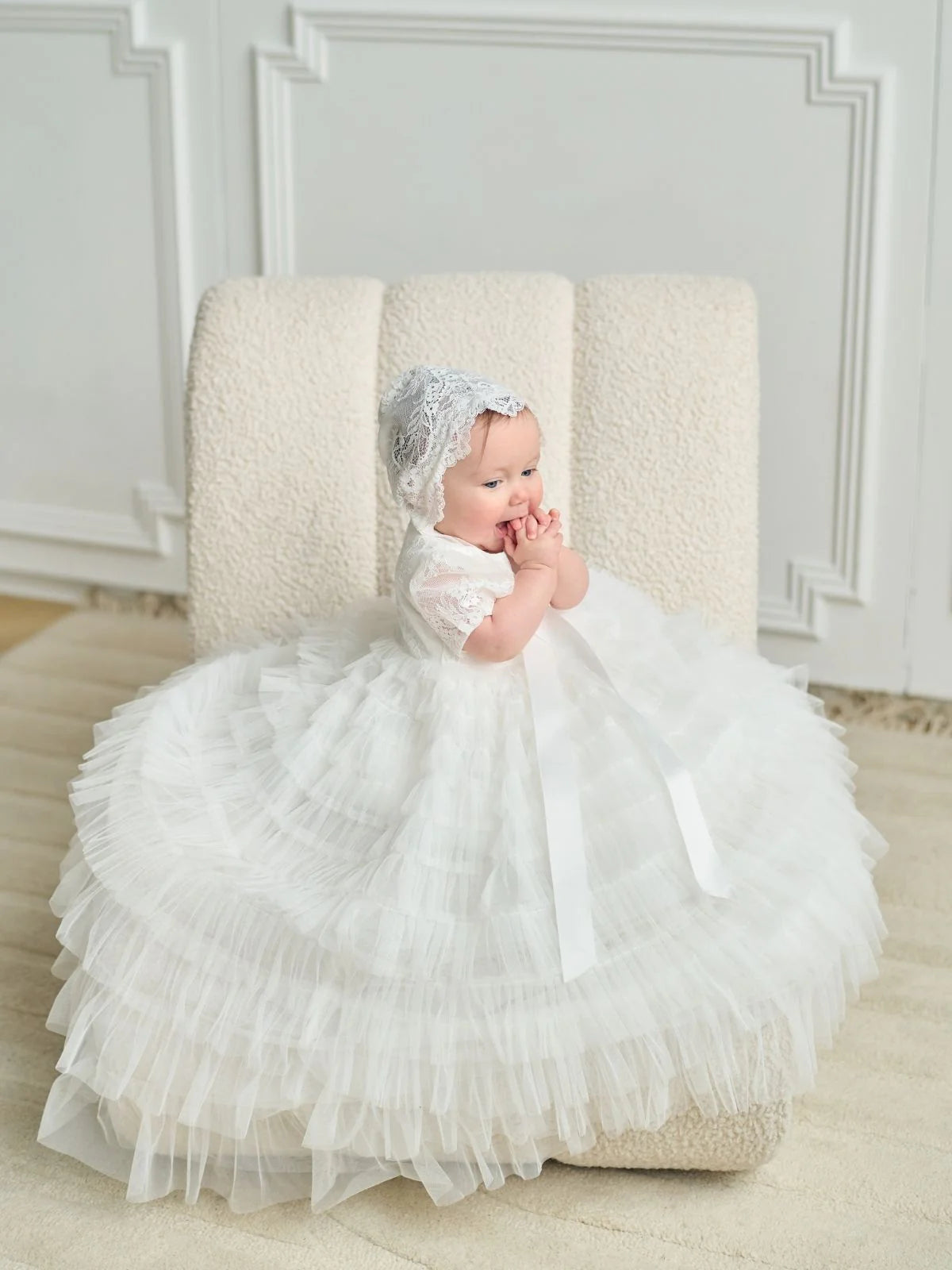 TDelicate and full of charm, the Eden christening gown from Teter Warm features soft lace puff sleeves, a classic round neckline, and a beautifully tiered ruffle tulle skirt that cascades with movement. Designed with a full-length silhouette and finished with a satin bow sash, this heirloom-quality dress is the perfect choice for a baptism, christening, or other sacred milestone. The intricate lace bonnet completes the traditional look with timeless grace.