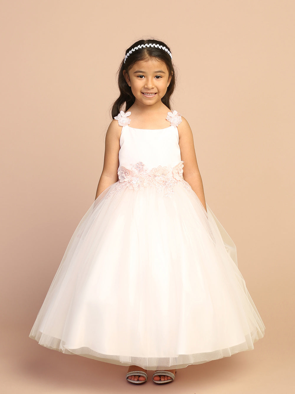The Elara Floral Tulle Dress is an enchanting piece designed for the most special occasions. This gown features a delicate satin bodice adorned with floral appliqués and pearl accents, while the elegant straps add a touch of charm. The soft tulle skirt flows gracefully, making it perfect for twirling moments. A beautiful bow detail at the back completes the look, ensuring she feels like a princess. Ideal for first communions, flower girl roles, or other memorable celebrations, the Elara Dress combines elegance and comfort for your little star’s big day.