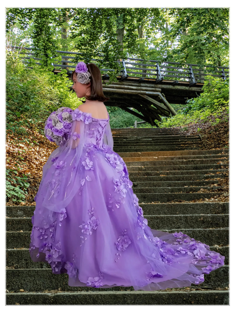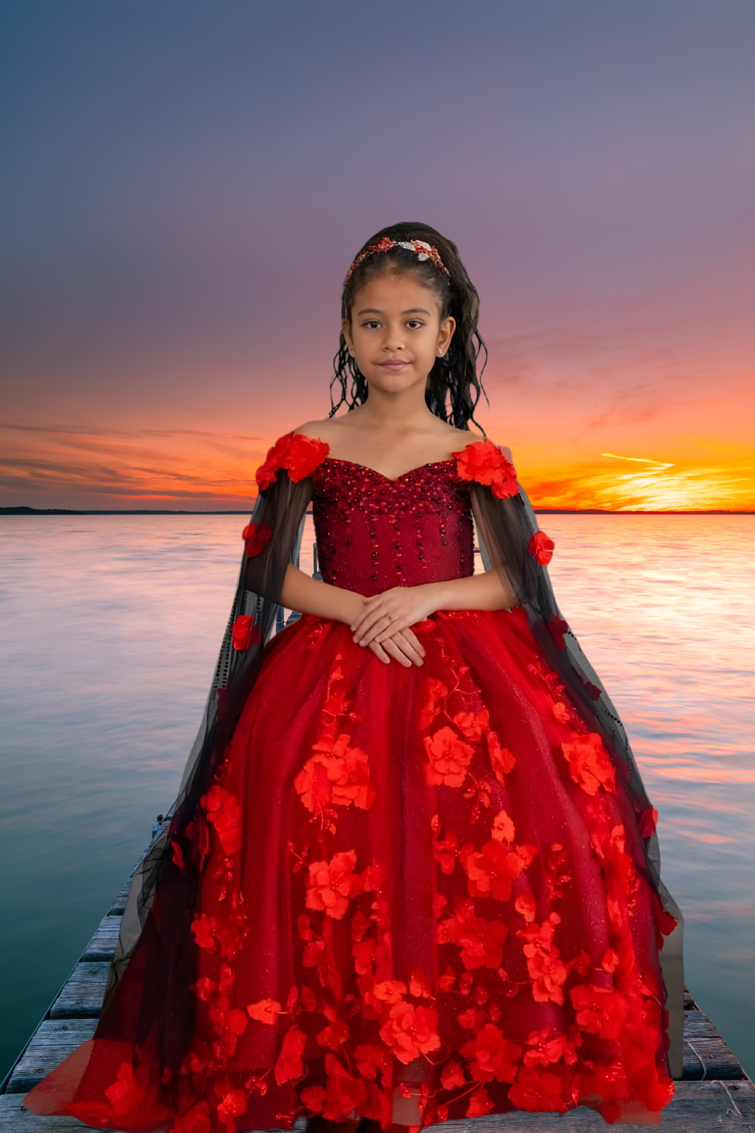 Introducing our Princess Collection of elegant flower girl dresses with stunning 3D floral designs! Perfect for the little princess in your life, these dresses are sure to make her feel like royalty on your special day. Each dress features delicate off the shoulder sleeves and a sweetheart neckline that adds a touch of elegance. The sheer cape adds a whimsical and fairy-tale quality to the ensemble. But the real showstopper is the intricate 3D floral design that covers the entire dress, giving it a magical and enchanting look.