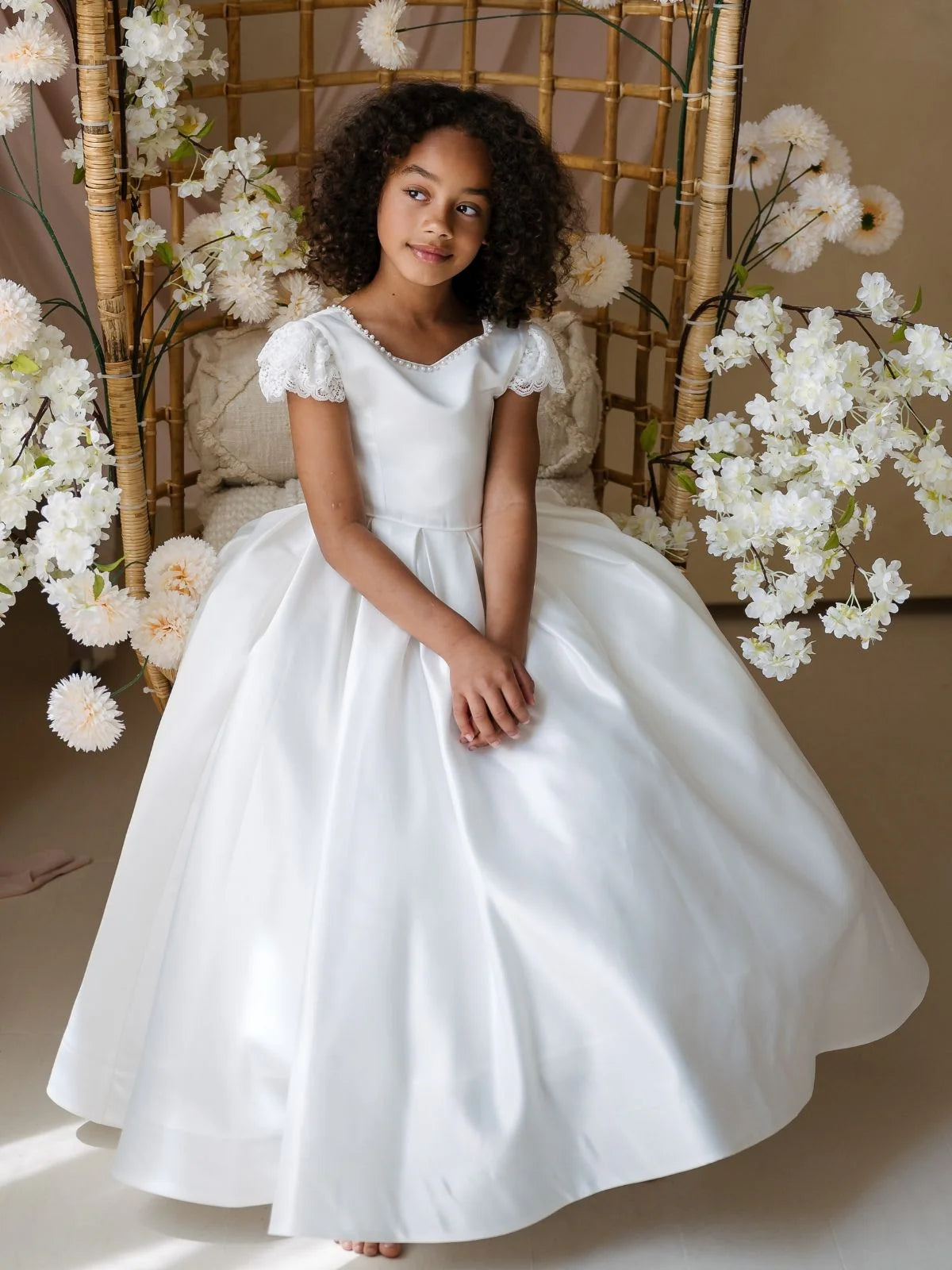 Elevate your little one's style with this charming white dress. Featuring delicate lace cap sleeves, a full satin skirt, and a statement bow at the back, this dress is perfect for weddings, birthdays, or any special occasion. Designed with comfort and elegance in mind, it's a timeless addition to your child's wardrobe.