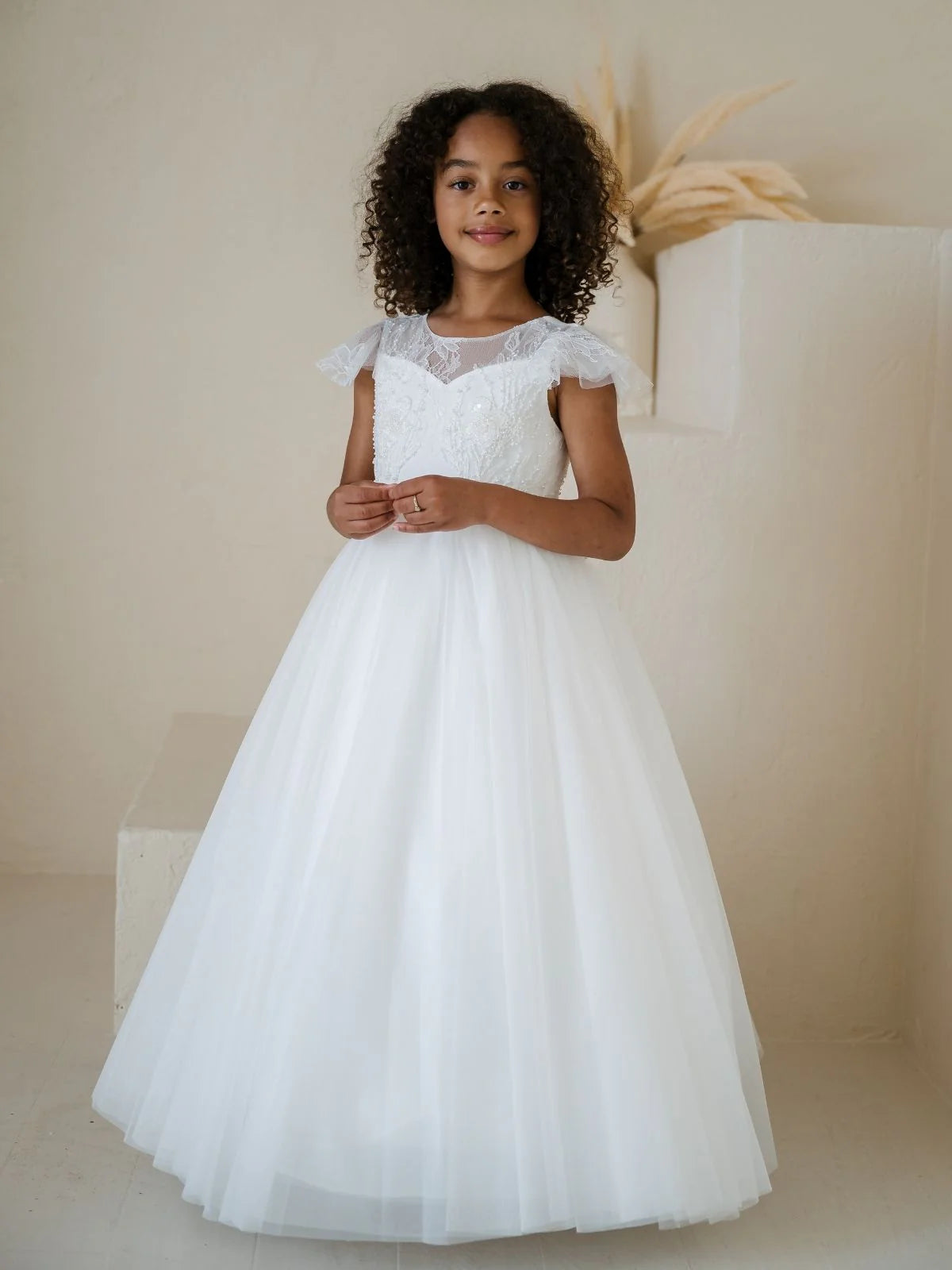 Elegant and ethereal, the Elodie Grace Gown is a beautiful choice for communion, flower girl, or any special occasion. This dreamy white ballgown features delicate lace cap sleeves, a sheer illusion neckline, and intricately embroidered floral appliqués across the bodice. The full tulle skirt flows gracefully to the floor, creating a timeless silhouette that feels both refined and romantic. Finished with a soft satin waistband and pearl button detailing along the back, this gown captures classic beauty with a modern touch.