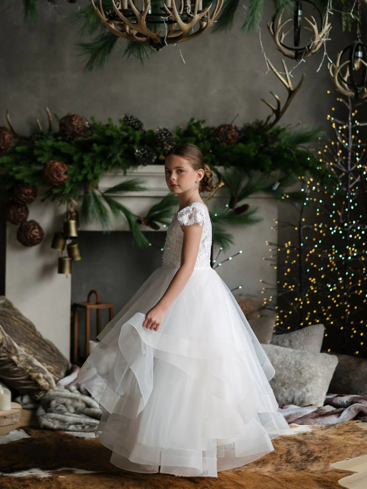 The Felecia dress by Teter Warm Couture is a breathtaking layered ball gown designed for unforgettable moments. This elegant white dress features delicate flutter sleeves, a floral-embroidered bodice, and a cascading tulle skirt with horsehair trim for extra volume and grace. A soft round neckline and comfortable fit make it perfect for young girls celebrating their first communion, serving as flower girls, or attending formal occasions. Felecia is timelessly enchanting—made for memories that last forever.
