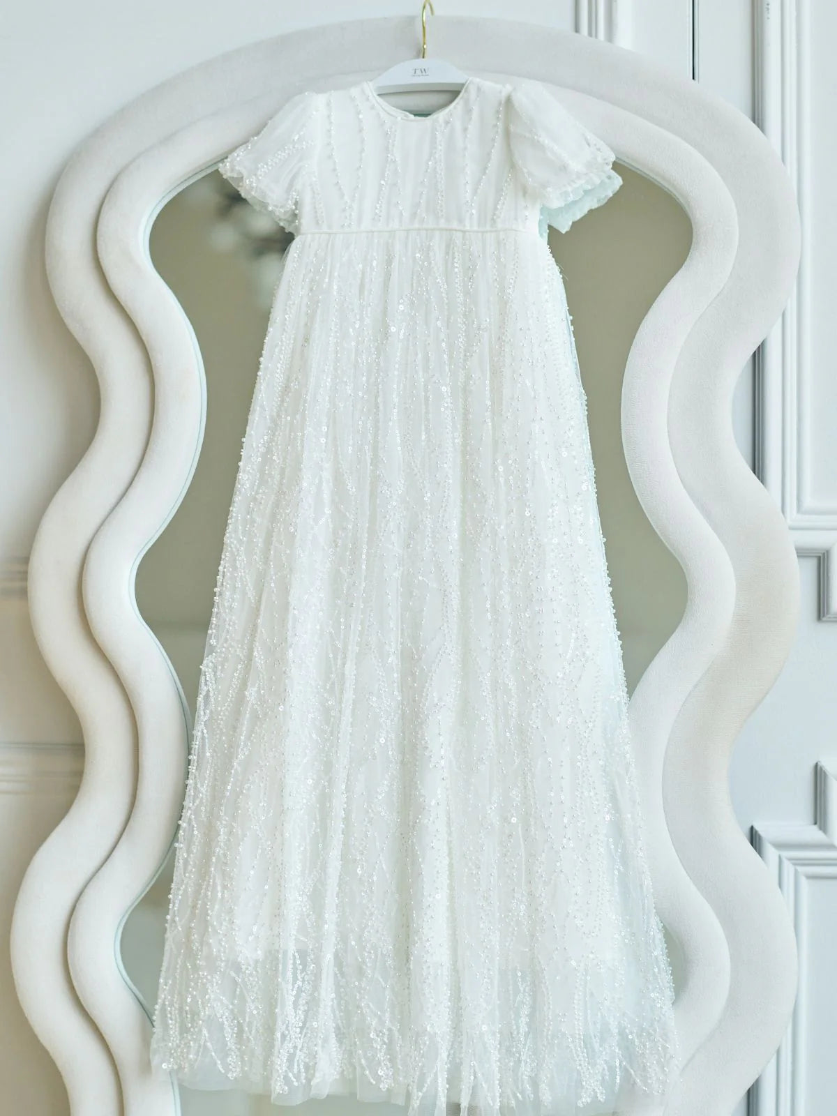 The Evangeline Christening Gown is a cathedral-length masterpiece designed for unforgettable baptism moments. Dazzling with hand-beaded detailing and delicate puff sleeves, this ethereal gown sparkles with grace and elegance. The flowing silhouette and refined craftsmanship offer a timeless look for your baby girl's most sacred celebration. Fully lined. Back zip closure. Hand wash only.