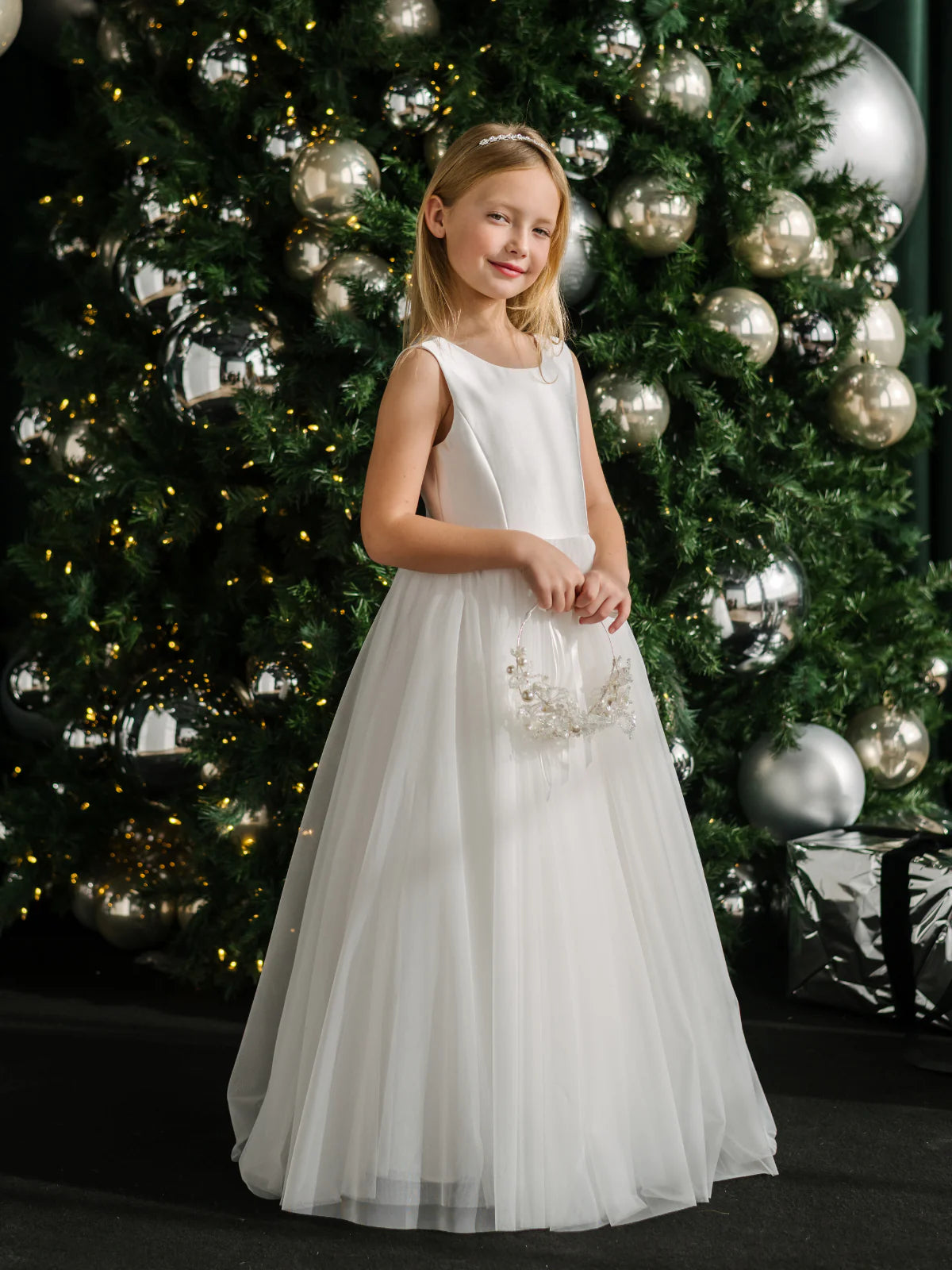 The Evangeline Teter Warm Couture Gown is a refined and timeless design created for life’s most meaningful celebrations. Featuring a smooth satin bodice paired with a flowing layered tulle skirt, this gown offers an elegant silhouette that feels light, graceful, and beautifully classic. The sleeveless design allows for effortless movement and comfort, while the full-length tulle skirt adds soft volume and a delicate couture finish. Perfect for First Communion, flower girl ceremonies, church events, and formal special occasions, the Evangeline gown embodies purity, sophistication, and understated luxury. Designed to photograph beautifully and feel comfortable throughout the day, this couture piece is an heirloom-worthy choice for families seeking elegance without excess.