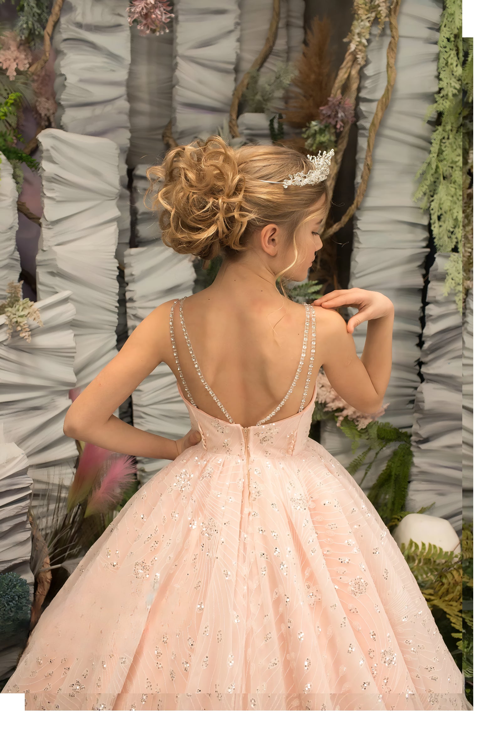Step into a world of elegance with the Everly Rose Couture Gown—a breathtakingly designed formal dress for girls. This exquisite gown features a delicate blush-toned tulle adorned with shimmering embellishments, creating a soft yet regal look. Dazzling crystal straps lead to a perfectly fitted bodice with intricate hand-sewn details, while the voluminous skirt cascades into a dreamy, sparkling masterpiece. Designed for pageants, birthdays, and milestone celebrations, this gown ensures every little girl feels like royalty.