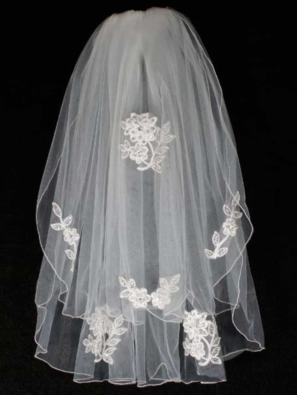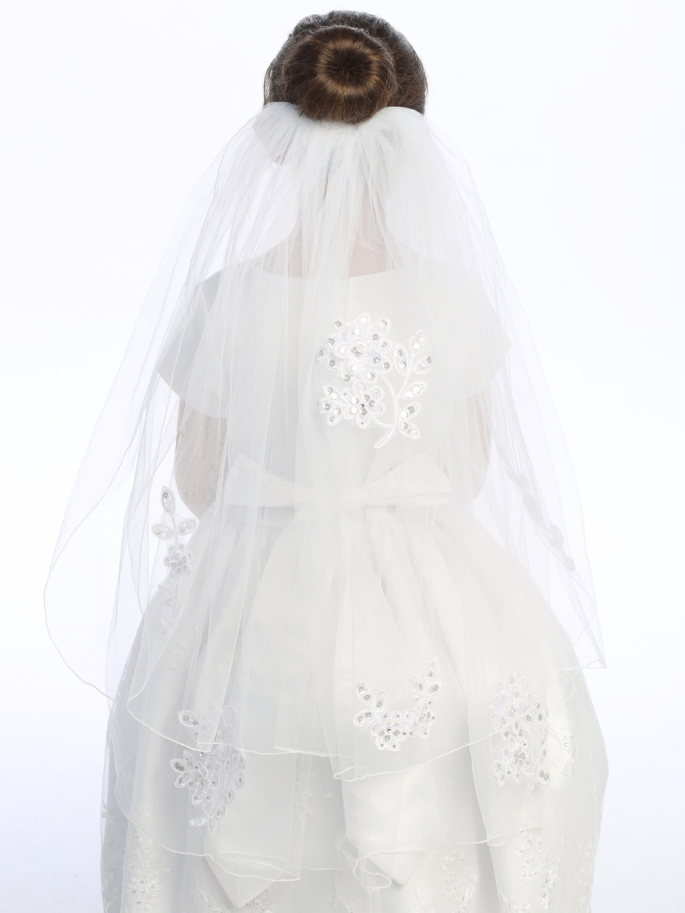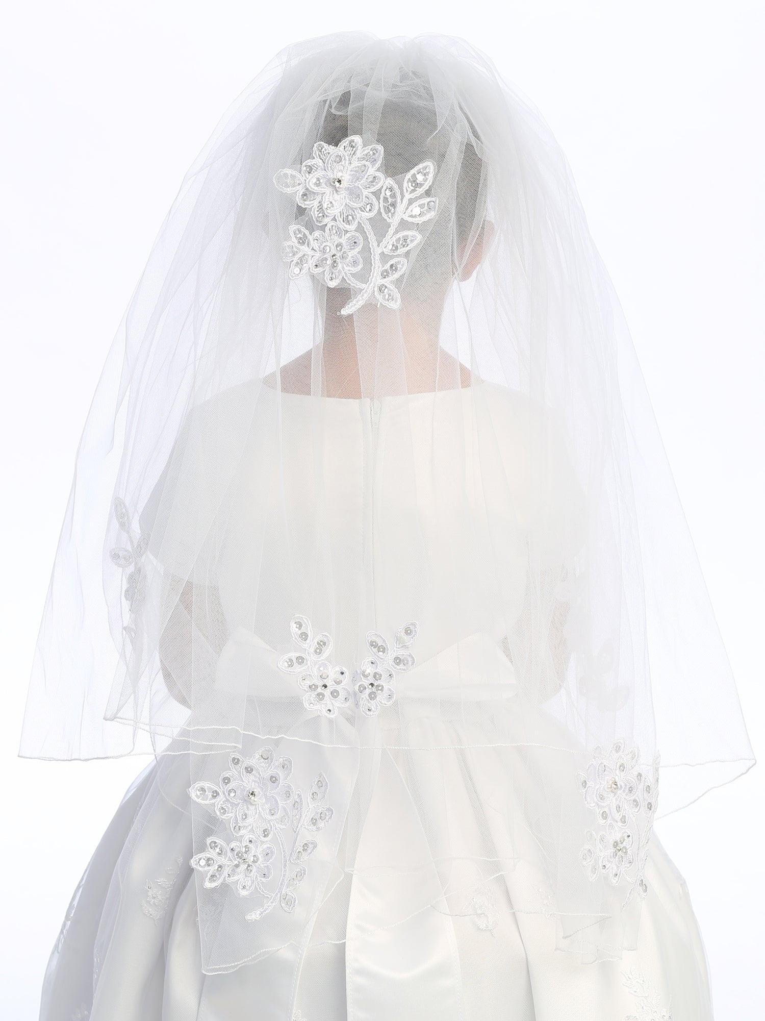 Add a timeless touch to your child’s special day with the Evie Kids Two-Tier First Communion Veil, available in 25" and 29" lengths. Featuring delicate floral lace appliqués and subtle beadwork, this elegant veil beautifully complements any Holy Communion dress. The layered design provides a graceful drape, while the soft tulle fabric ensures comfort. Perfect for First Communion, flower girl attire, or other cherished religious ceremonies, this veil completes the classic look with charm and grace. Comes securely attached to a comb for easy wear.