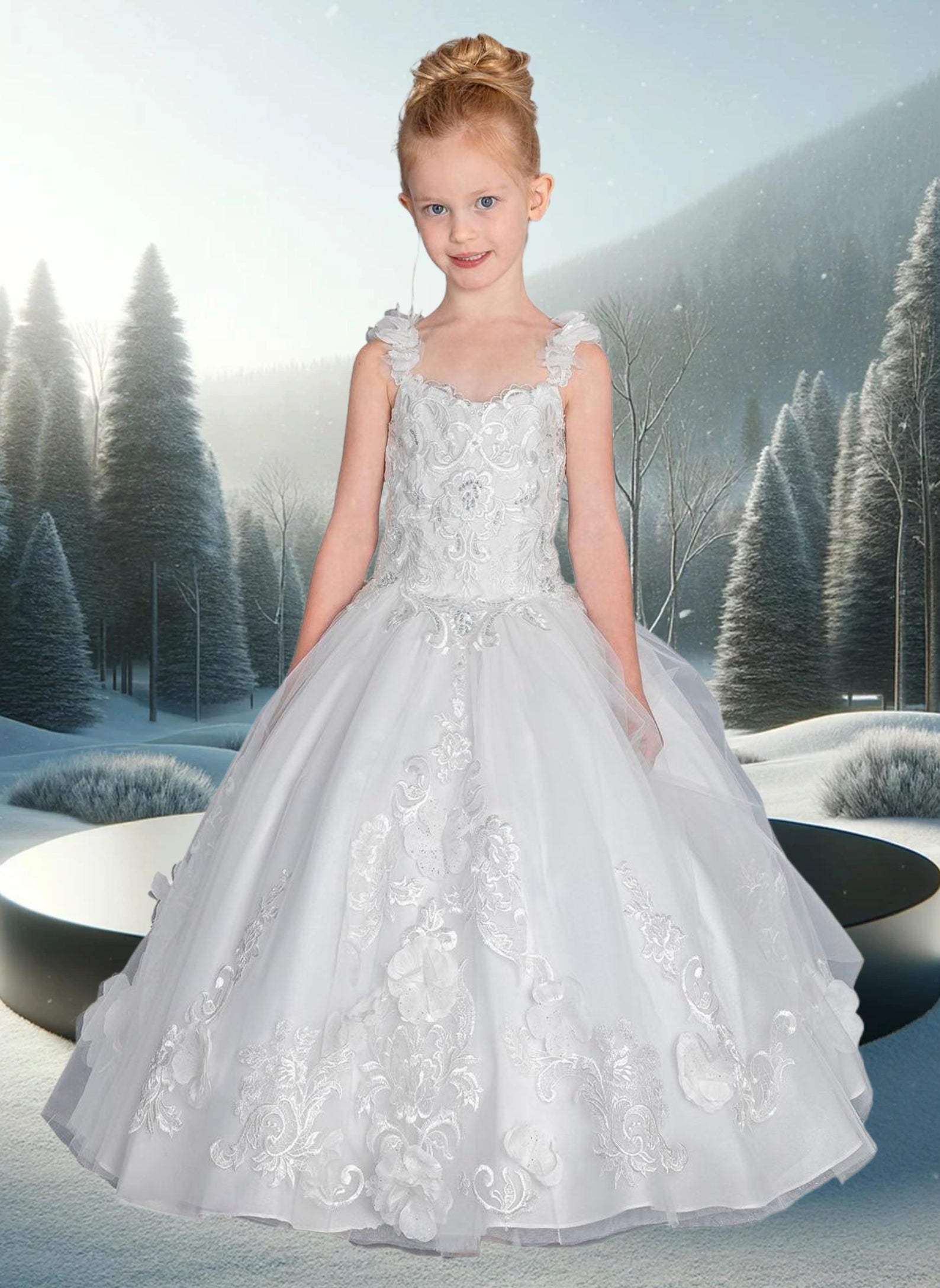 Grace and enchantment come to life in the Felicity Rose Gown. This exquisite girls’ ball gown features delicate 3D floral appliqués, shimmering embroidery, and fluttering tulle shoulder straps that add a whimsical touch. The softly structured bodice leads to a voluminous skirt layered with embroidered detailing that makes every twirl magical. Available in blush pink or white, this gown is a picture-perfect choice for pageants, flower girl duties, or any unforgettable celebration.