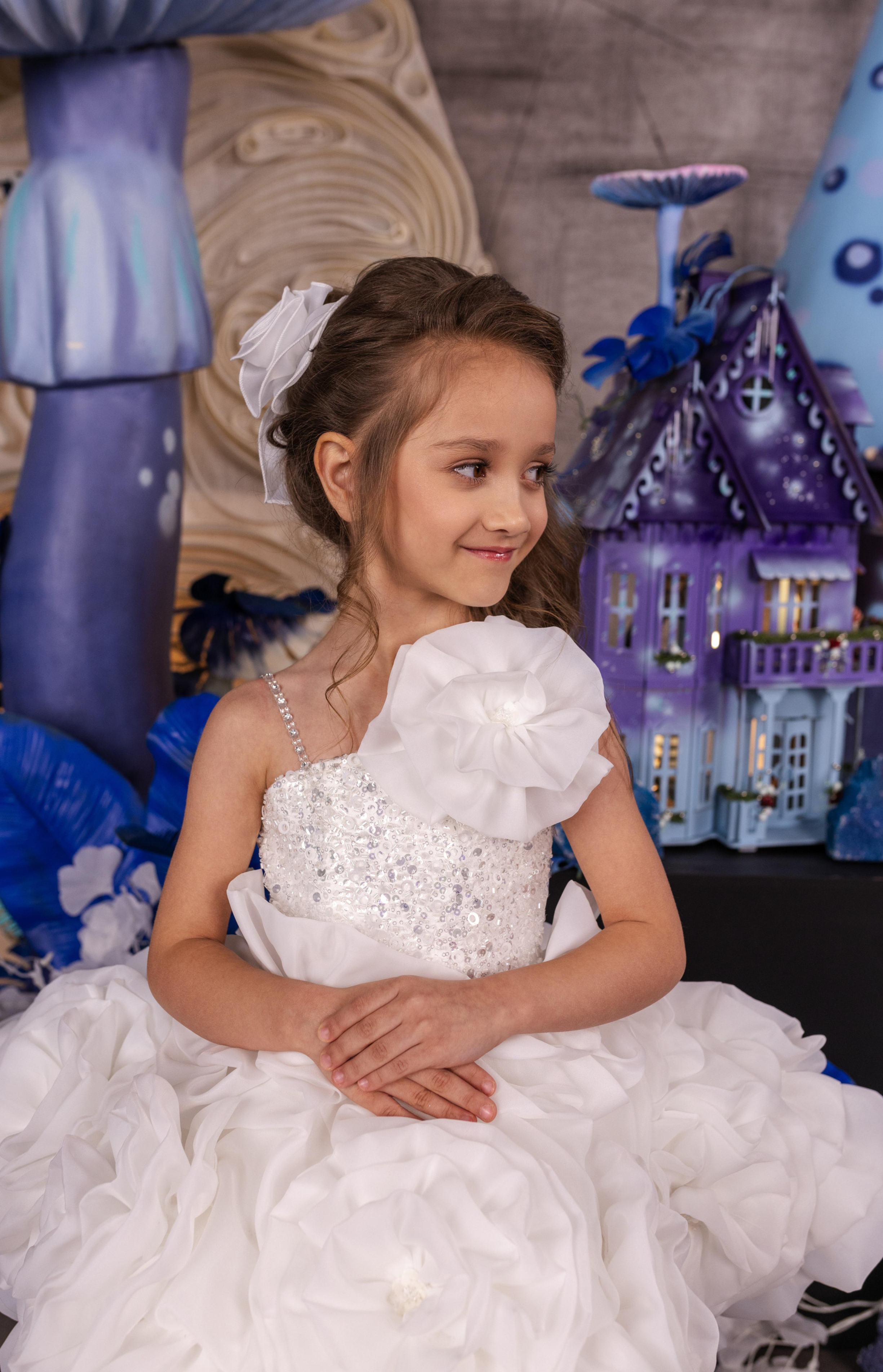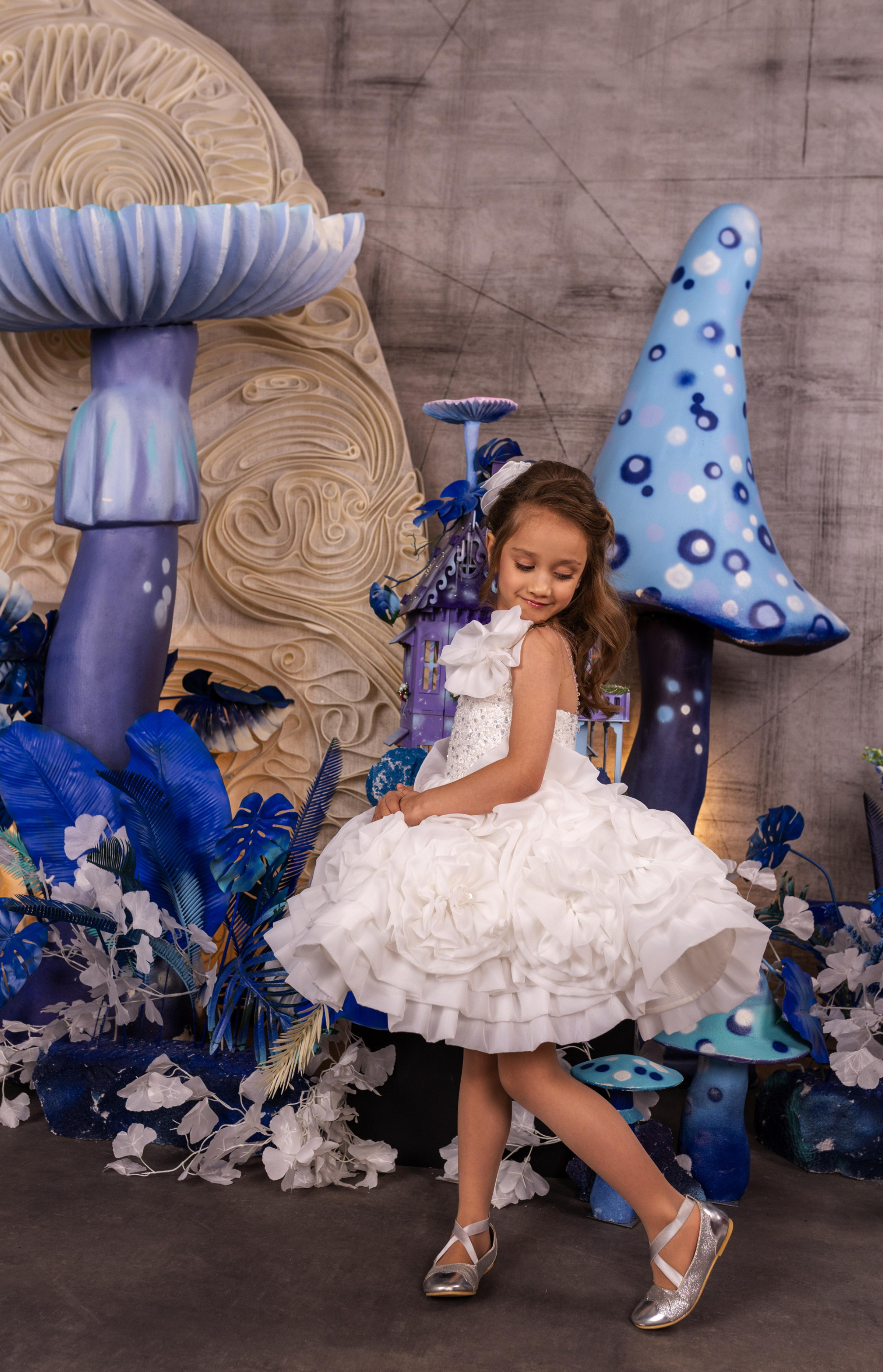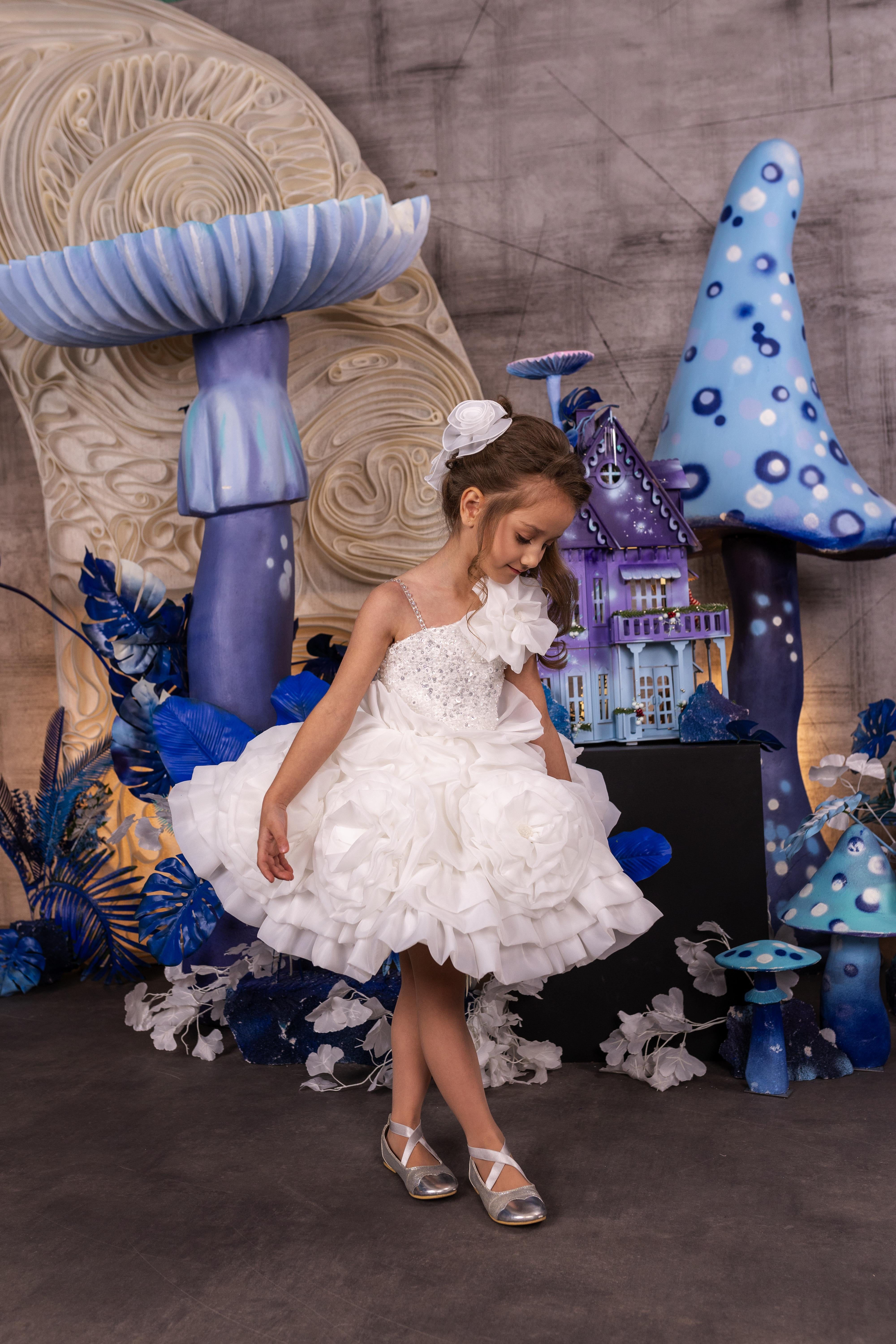 The Fleur Radiance Dress is a delightful masterpiece of elegance and charm. This stunning white dress features a shimmering sequin bodice, delicate floral appliqués, and a voluminous layered skirt adorned with soft, ruffled flowers. Designed for flower girls, pageants, and special occasions, the Fleur Radiance Dress adds a touch of magic to any event. The one-shoulder floral detail and sparkling accents ensure your little one looks and feels like a star. Fully customizable for a perfect fit, this gown embodies grace and beauty.