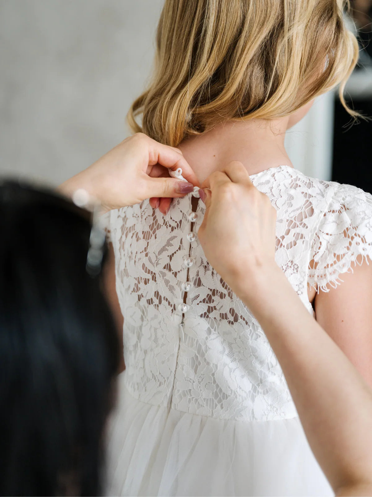 The Florienne Dress by Teter Warm Couture is a timeless first communion gown designed with exquisite attention to detail. Featuring a beautifully crafted lace bodice with delicate cap sleeves, this dress offers a classic silhouette that feels graceful and refined for such a meaningful occasion. The full tulle skirt is softly layered and finished with subtle structure for elegant volume and movement, creating a polished look that photographs beautifully from every angle. A pearl-button back closure adds a traditional couture touch, enhancing the gown’s heirloom quality. Ideal for first communion, flower girl moments, church ceremonies, and special formal occasions, the Florienne Dress is a sophisticated choice for families seeking a classic communion dress with elevated craftsmanship and lasting beauty.