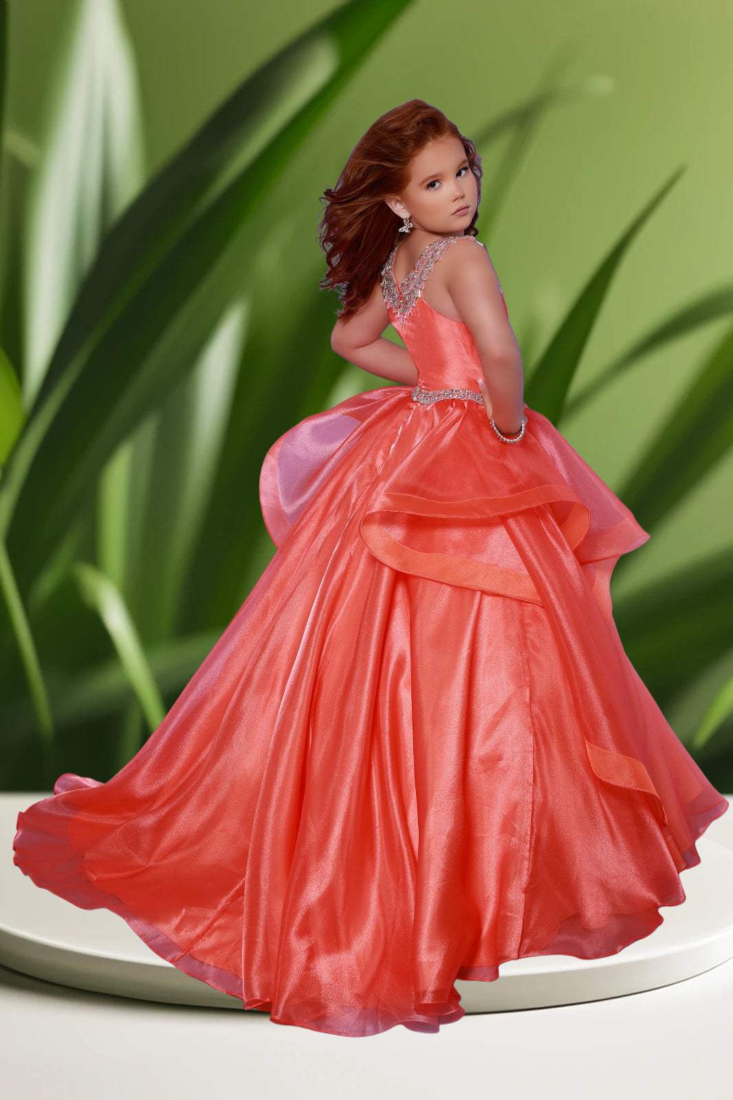Make a glamorous impression in the Gianna Sunset Gown from the 2Cute Collection — a rich coral satin masterpiece designed for standout moments. Featuring a rhinestone-encrusted neckline and waist, along with dramatic tiered side panels that flow into a full ball gown skirt, this dress was made for pageants, flower girl entrances, birthdays, and portraits. Crafted with sophistication and sparkle, it brings radiant charm to every twirl. A fresh, modern take on classic pageant elegance, exclusively at Blush Kids Luxury Couture.
