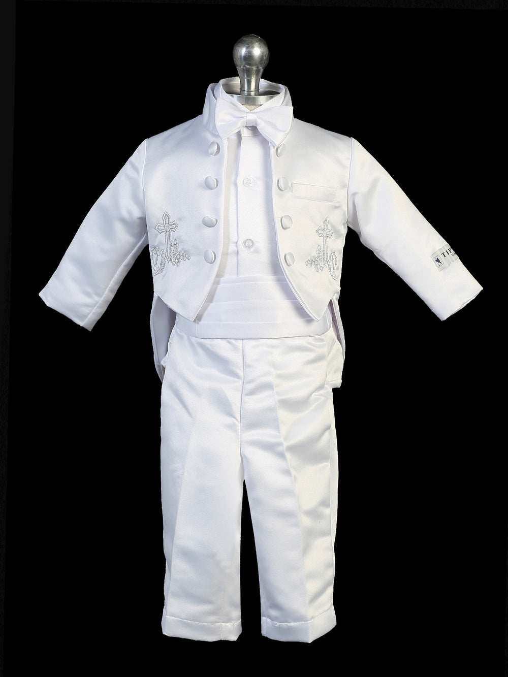 The Giovanni Tailed Christening Tuxedo is a refined and regal look for your little one’s sacred occasion. This 5-piece set includes a long-sleeve jacket with satin-covered buttons, embroidered cross detailing on each side, matching trousers, a crisp shirt with pleated bib, an adjustable bow tie, and a coordinating cummerbund. The tailored fit and elegant cross embroidery make this a standout choice for baptisms, christenings, blessings, or formal baby dedications. The full ensemble captures classic charm with a ceremonial touch. Available in sizes 6M–24M and 2T–4T, offering an ideal fit for babies and toddlers alike.