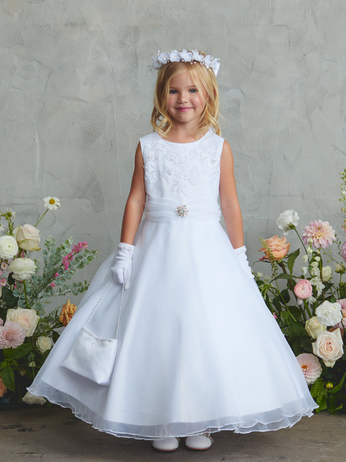 The Maria Bloom Dress is a beautifully graceful gown designed for first communion, flower girl celebrations, and formal special occasions. Crafted in classic white, this timeless style features a smooth satin bodice adorned with delicate floral lace appliqué and soft pearl accents for a refined touch of detail. A sheer organza waistband is finished with a sparkling crystal brooch at the center, creating a polished and elegant silhouette. The full organza skirt flows effortlessly to ankle length, offering gentle volume and comfortable movement throughout the day. A statement bow at the back completes the look with charming tradition, making this dress ideal for church ceremonies, portraits, weddings, and milestone events.