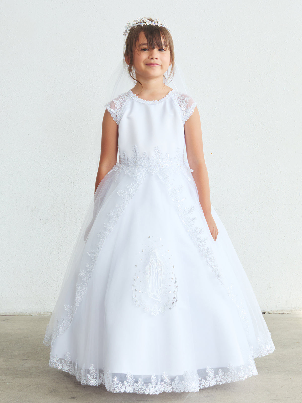 Girls Communion Dress with Virgin Mary | White Floor Length Gown
