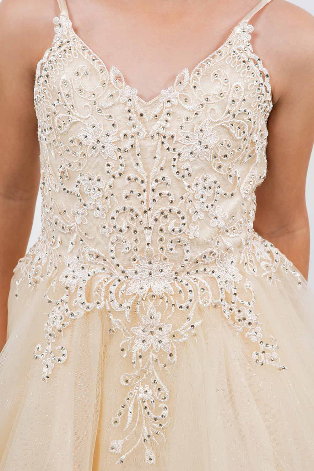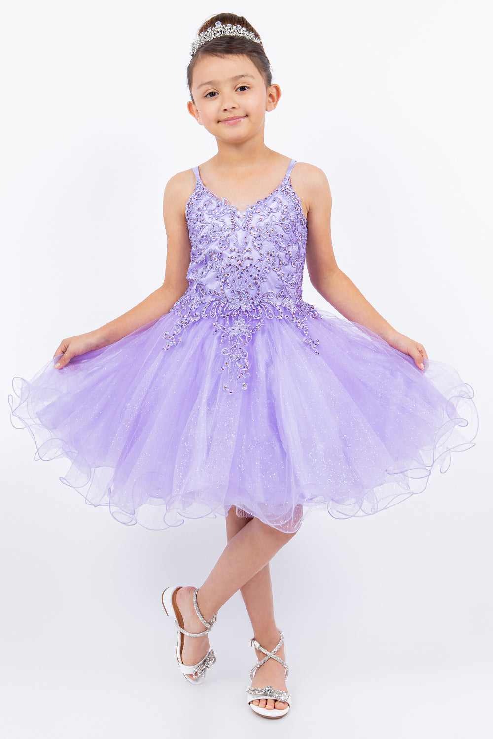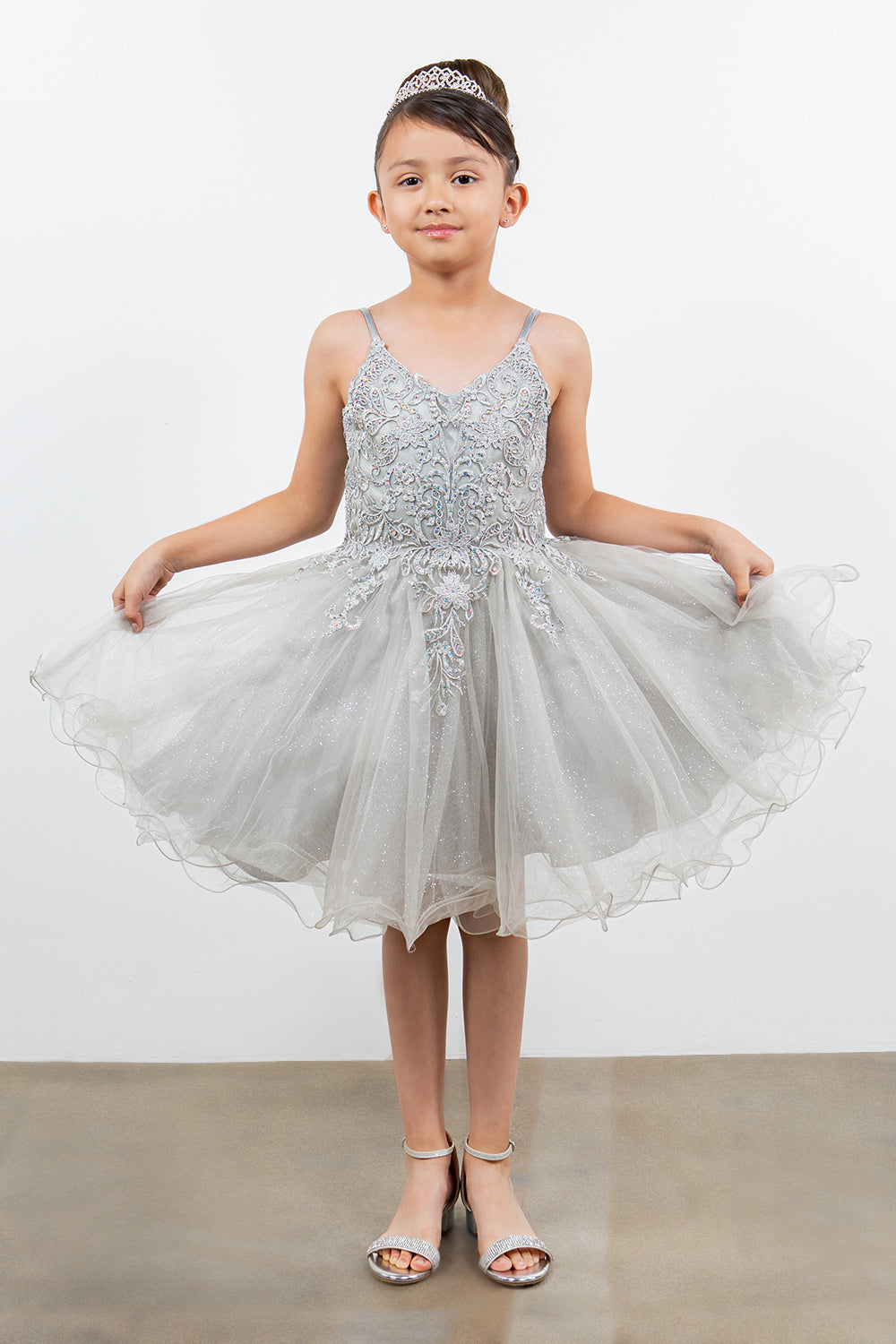 Transform your little girl into a fairy-tale princess with our Marla Crystal Embellished Girls Tulle Pageant Short Dress. This stunning double spaghetti strap dress features intricate rhinestone embroidered tulle, creating a magical shimmer effect. The corset back allows for easy entrance and ensures a comfortable, customized fit for your little one. Complete with a dazzling rhinestone embroidered applique, this dress is perfect for pageants, recitals, or any special occasion where she wants to shine like a star. Make her feel like royalty in our Marla dress!