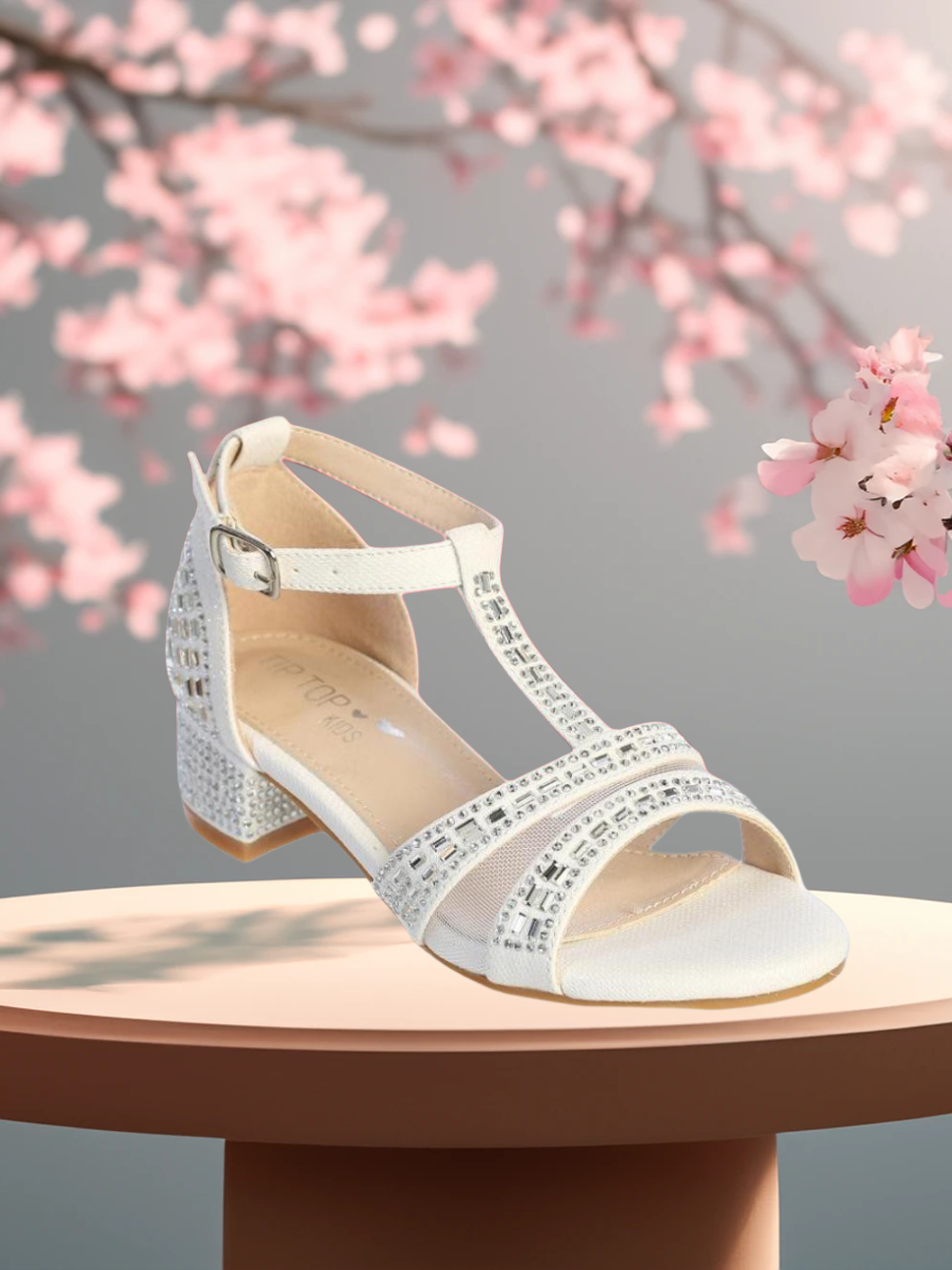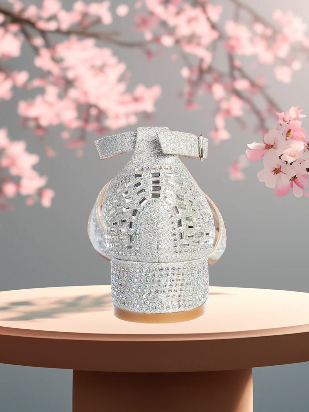 A dazzling finishing touch for your little one’s special day. These girls’ glitter block heel sandals feature radiant rhinestone detailing and a secure ankle strap, perfect for communions, flower girl duties, pageants, and special occasions. With a comfortable mid-heel design, they offer just the right height while keeping her steady and confident. Available in rose gold, silver, and white, these sandals pair beautifully with our couture dresses and add a sparkle to every step. Offered in sizes 9-10 and 1Y-5Y.