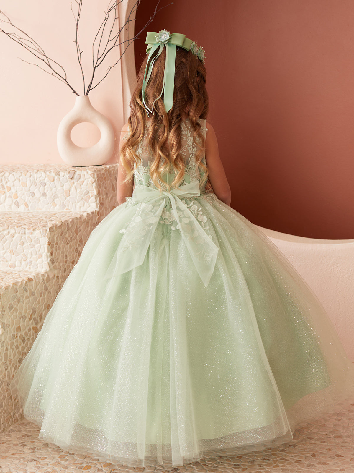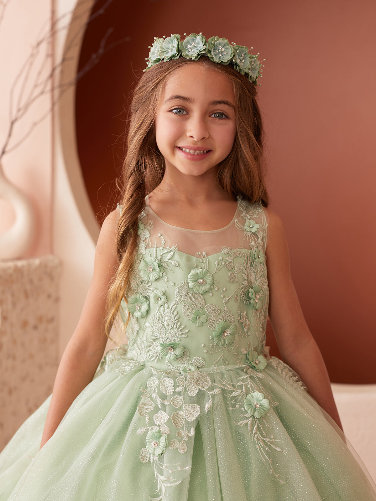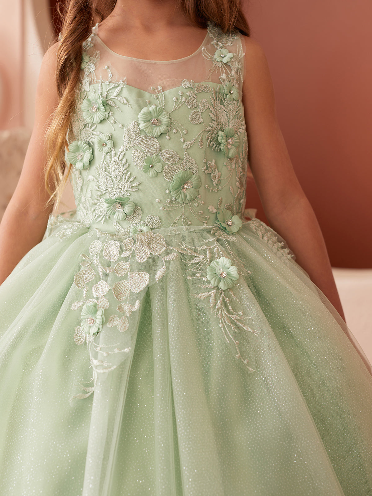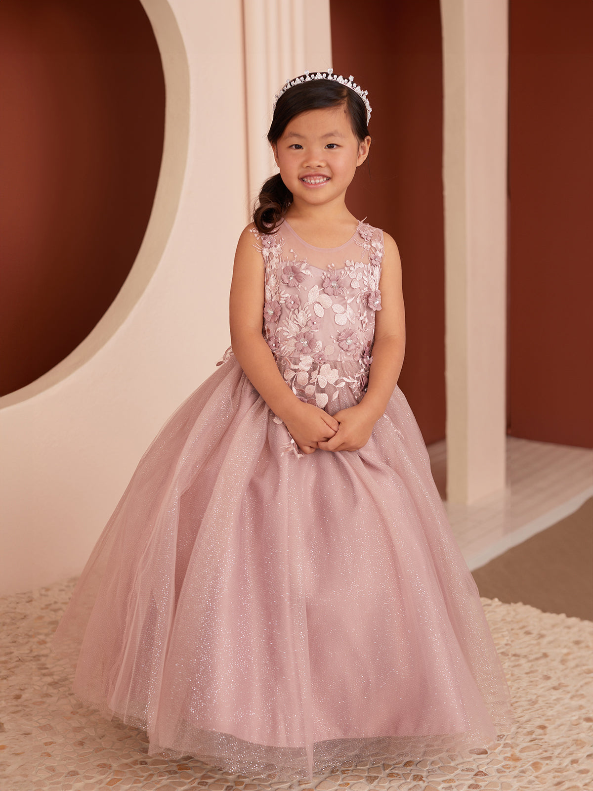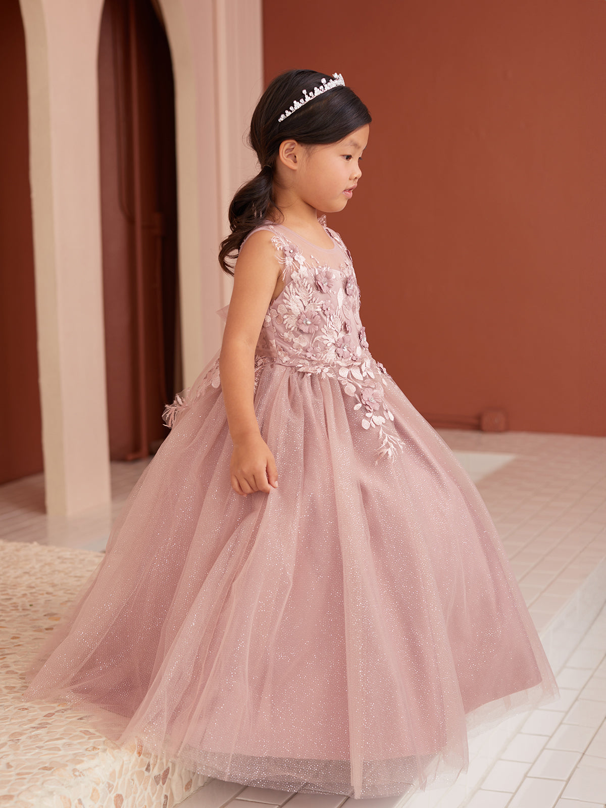 Step into a world of fairy-tale elegance with the Celine Glitter Tulle Girls Dress, a dazzling creation that's sure to make any little girl feel like royalty. The dress features an illusion neckline bodice that combines the magical allure of transparency with the security of full coverage, creating a sophisticated and modern silhouette. Adorning this ethereal bodice are delicate 3D flowers with beads, artfully placed to bring a garden of enchantment to life.