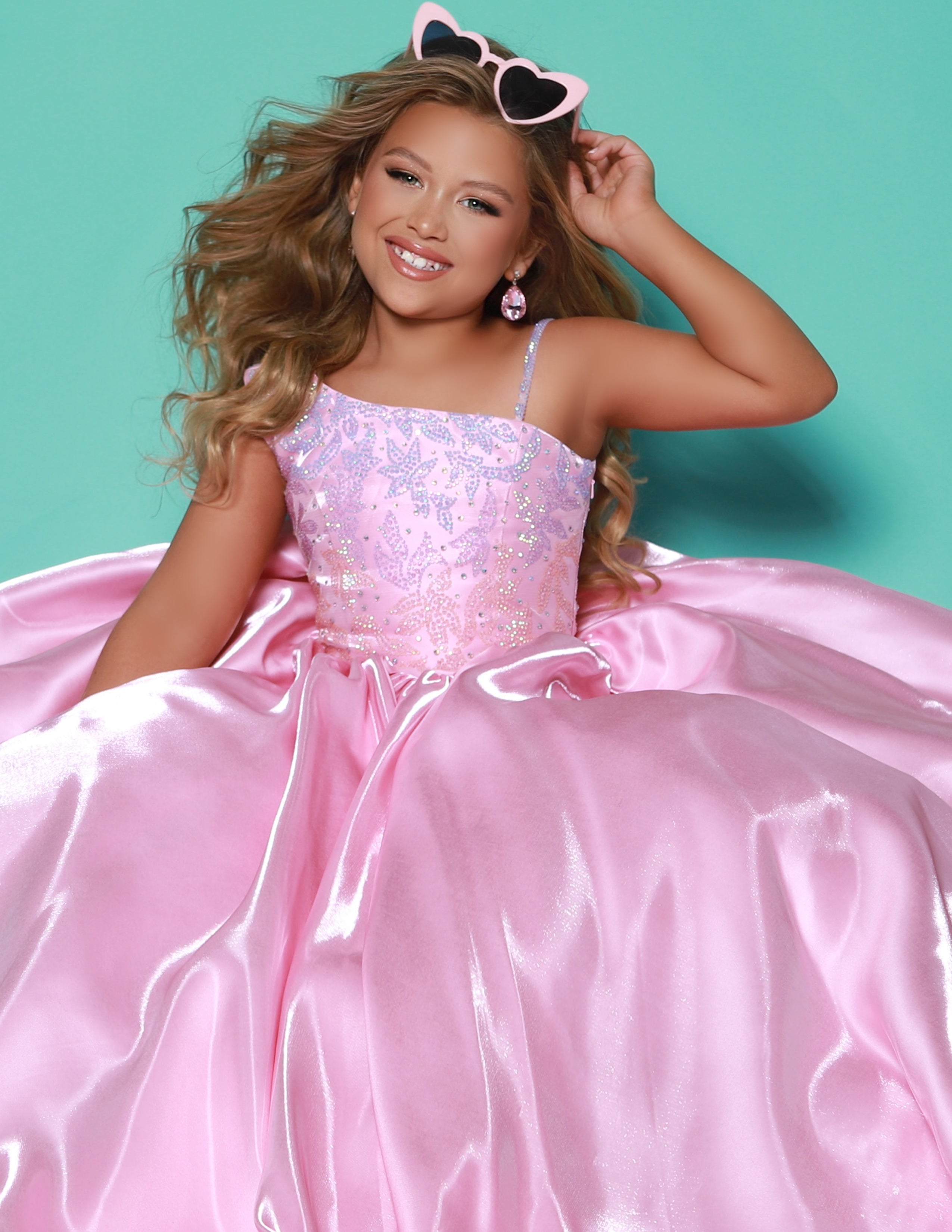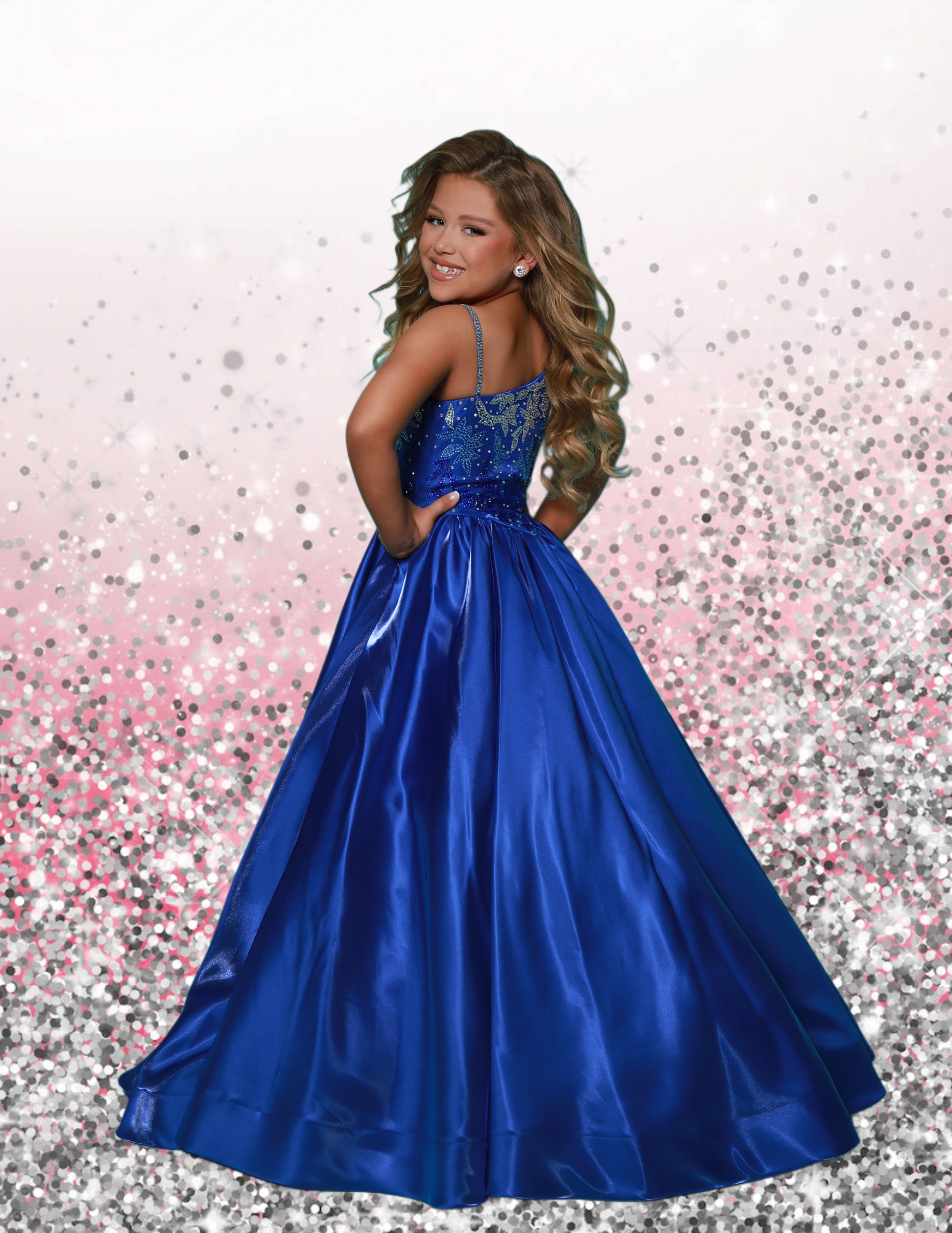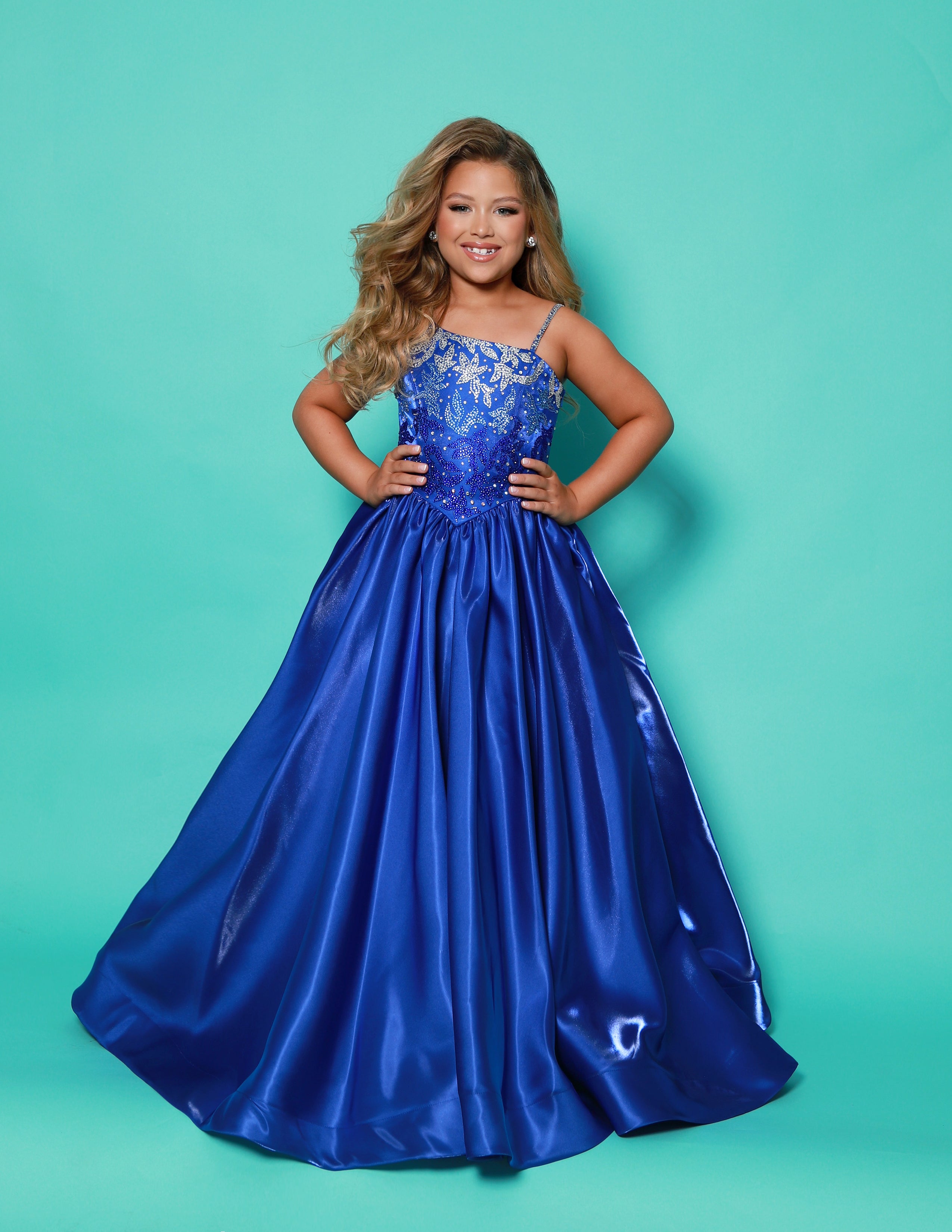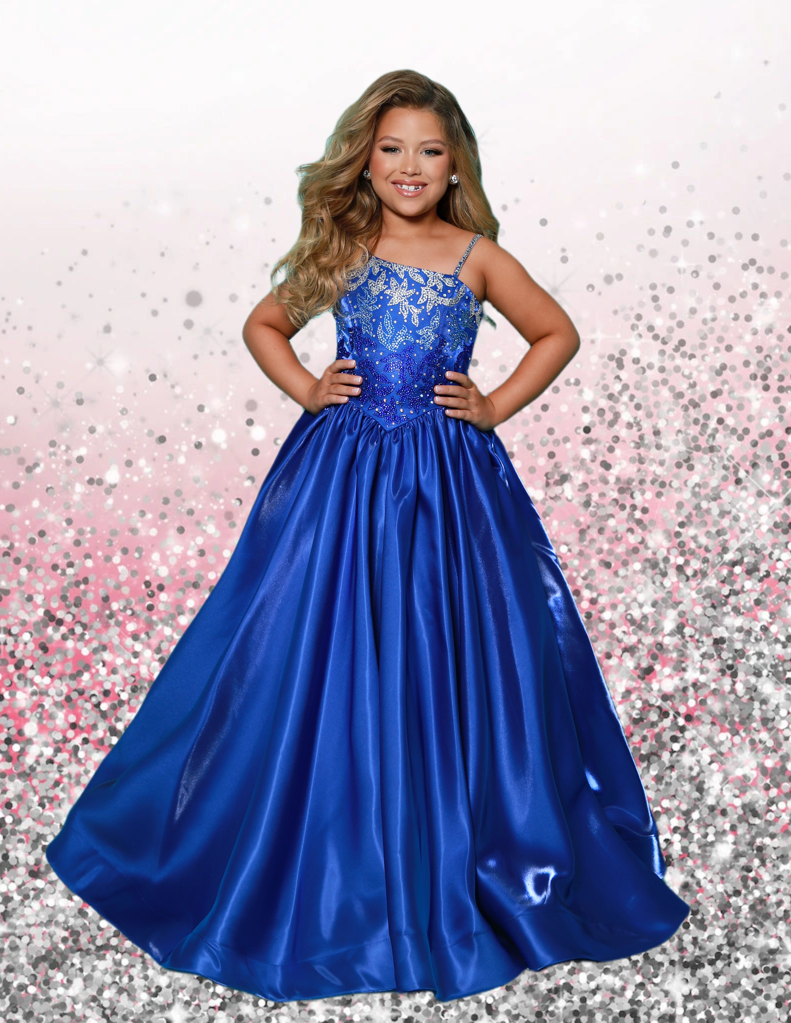 Designed to shine on the pageant stage, this breathtaking 2Cute girls pageant ball gown by Kate Parker is a true showpiece for little girls who love elegance and sparkle. The fitted bodice features delicate crystal embroidery with a soft asymmetrical neckline and slim straps, creating a refined yet age-appropriate silhouette. The full satin skirt flows beautifully with every movement, delivering dramatic volume that commands attention under stage lights. Available in soft pink and royal blue, this gown is ideal for little girls pageants, formal competitions, portraits, and special appearances. Crafted for comfort and confidence, the structured bodice offers support while allowing easy movement, making it perfect for long pageant days and award moments. This Kate Parker design blends classic pageant glamour with youthful charm, making it a standout choice for Blush Kids’ couture collection.