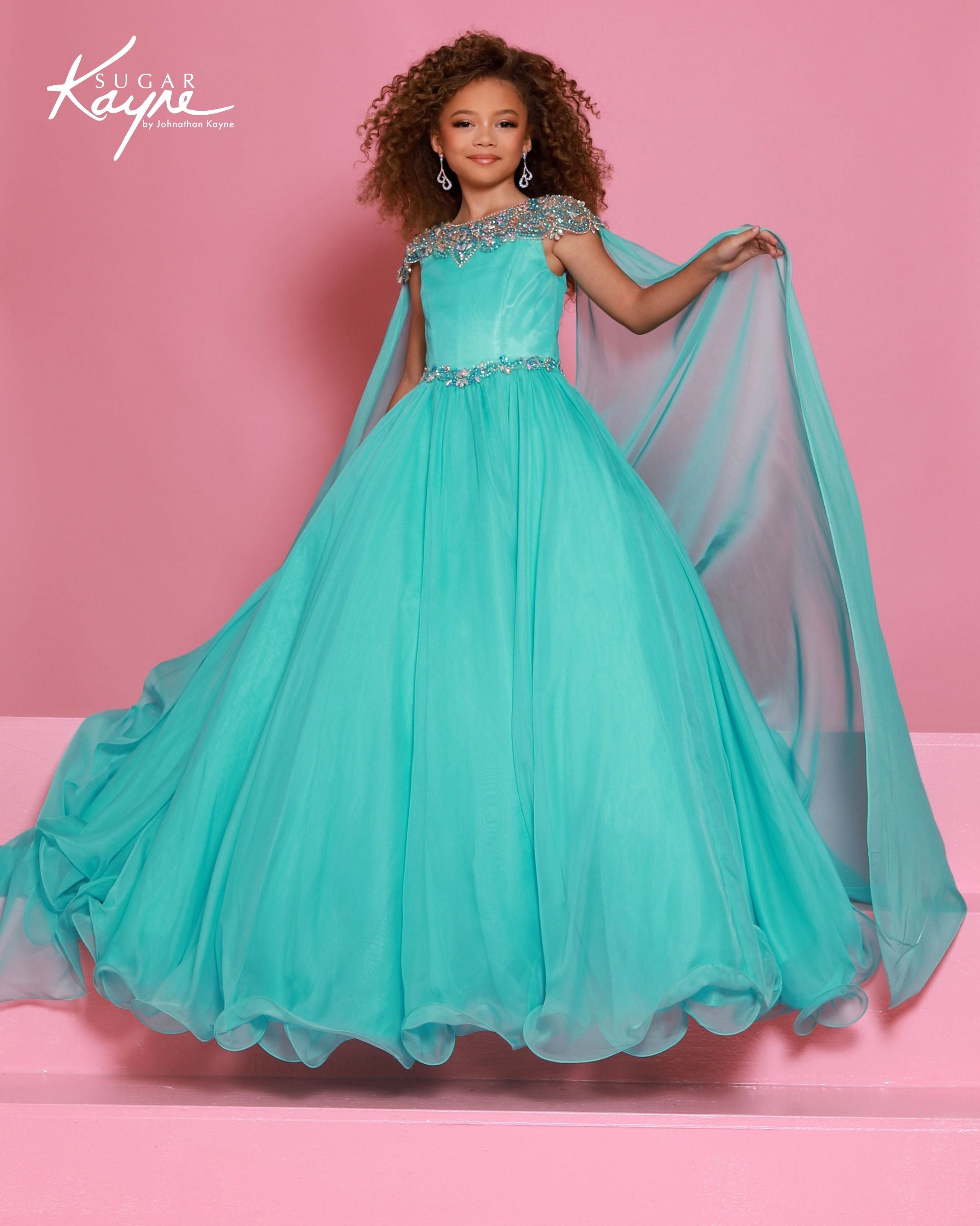 This breathtaking Sugar Kayne girls pageant gown is designed to command attention the moment she steps on stage. Featuring a refined fitted bodice adorned with shimmering beadwork and a flowing full skirt, this gown balances elegance with powerful stage presence. The dramatic sheer cape drapes gracefully from the shoulders, creating stunning movement under the lights and adding an unforgettable couture finish. Available in Aqua, Lemon, and Neon Pink, each color is thoughtfully chosen to flatter a wide range of skin tones and amplify confidence on stage. Aqua offers a fresh, radiant glow that feels modern and regal. Lemon delivers vibrant brightness that instantly lights up the stage and photographs beautifully. Neon Pink makes a bold, high-energy statement that stands out effortlessly during pageant competition. Designed for pageant finals, crowning moments, and grand stage appearances, this Sugar Kayne gown highlights poise, confidence, and individuality. Every detail is crafted to ensure she feels comfortable, confident, and absolutely unforgettable while showcasing her personality in the spotlight.