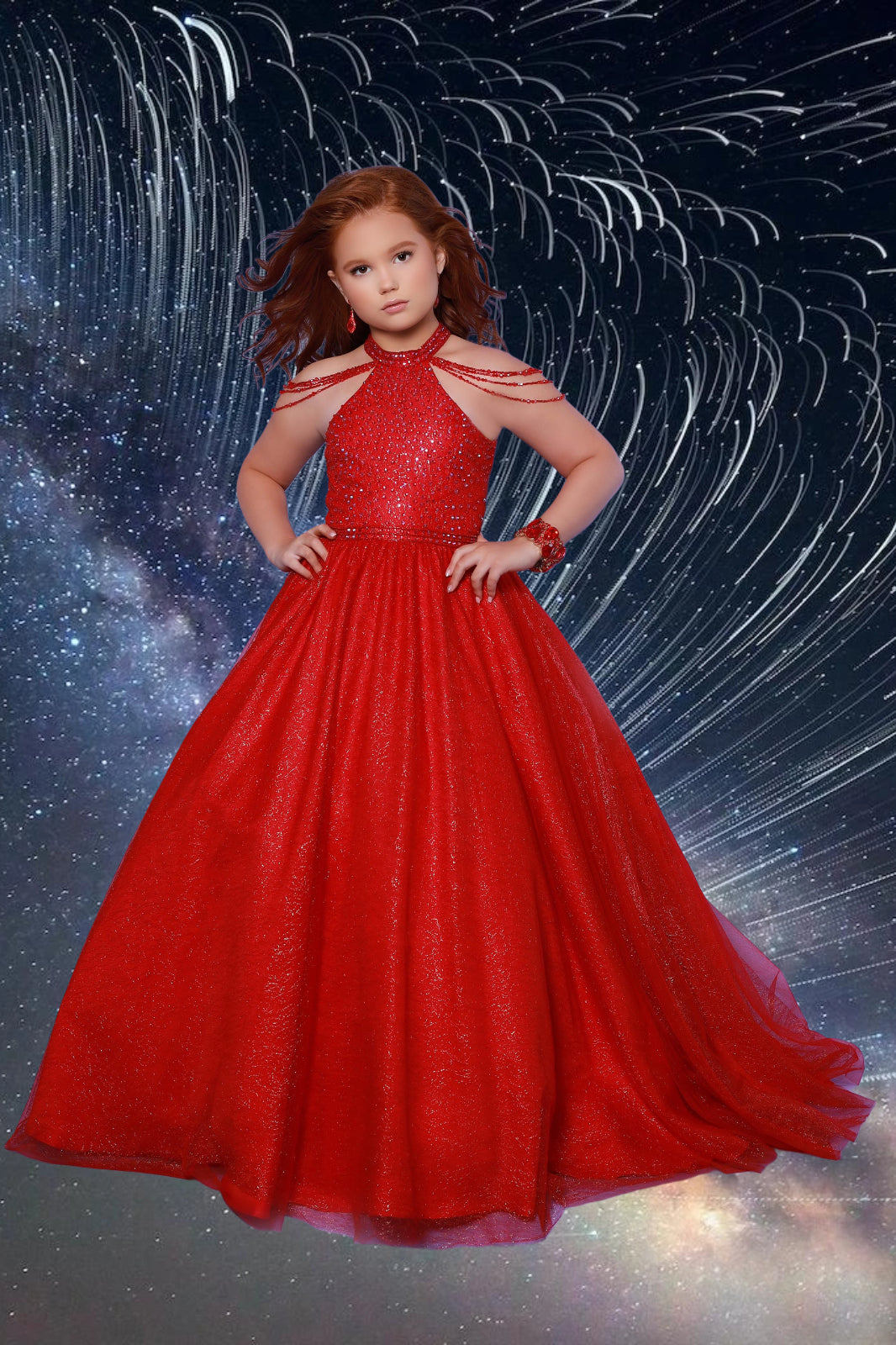 The Sienna Flame Gown from the 2Cute Collection is pure red-carpet magic. Designed with a sleek halter neckline, sparkling crystal embellishments, and cascading glitter tulle, this gown features statement shoulder strands that add elegant edge and confidence. The open back and voluminous silhouette make it the perfect choice for girls who love bold fashion and unforgettable entrances. Whether she’s walking in a pageant, celebrating a milestone, or posing for portraits, this gown delivers high drama with high shine.