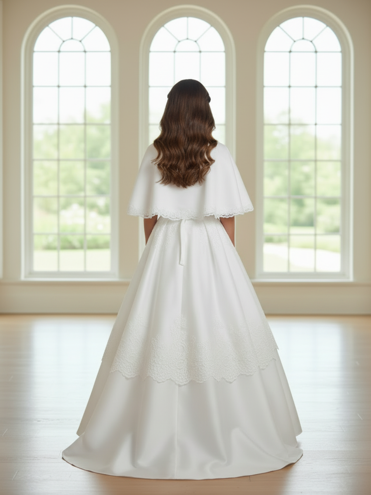 The Seraphine Lace-Trim Satin Cape is a graceful finishing piece designed to add elegance and modest coverage to any special occasion dress. Crafted from smooth satin and delicately edged with lace trim, this timeless cape features a soft tie neckline for a secure and comfortable fit. Flowing gently over the shoulders, it enhances communion gowns, flower girl dresses, and formal attire with refined beauty while preserving the silhouette beneath. Ideal for church ceremonies, portraits, and heirloom moments, this girls satin cape brings a couture-inspired touch to every meaningful celebration.