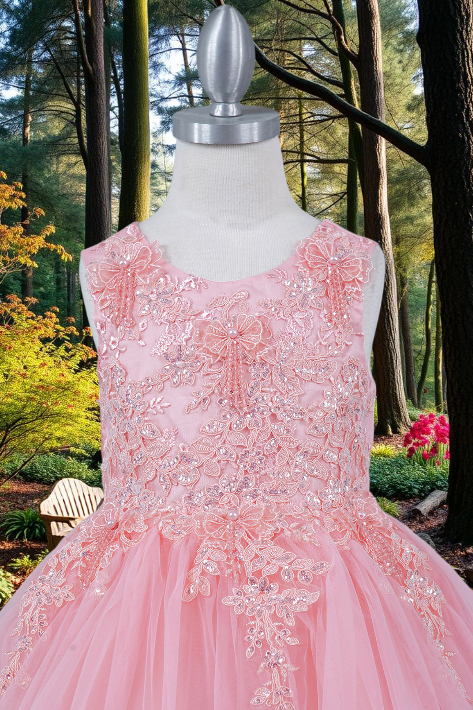 Make every occasion unforgettable with this charming girls’ short pageant and party dress. Designed with a fitted floral-embroidered bodice and a twirl-worthy layered tulle skirt, it offers the perfect blend of elegance and youthful charm. Available in blush, white, or champagne, this dress is ideal for birthdays, pageants, father-daughter dances, or any special celebration. A sweet bow accent at the back completes the look with timeless style.