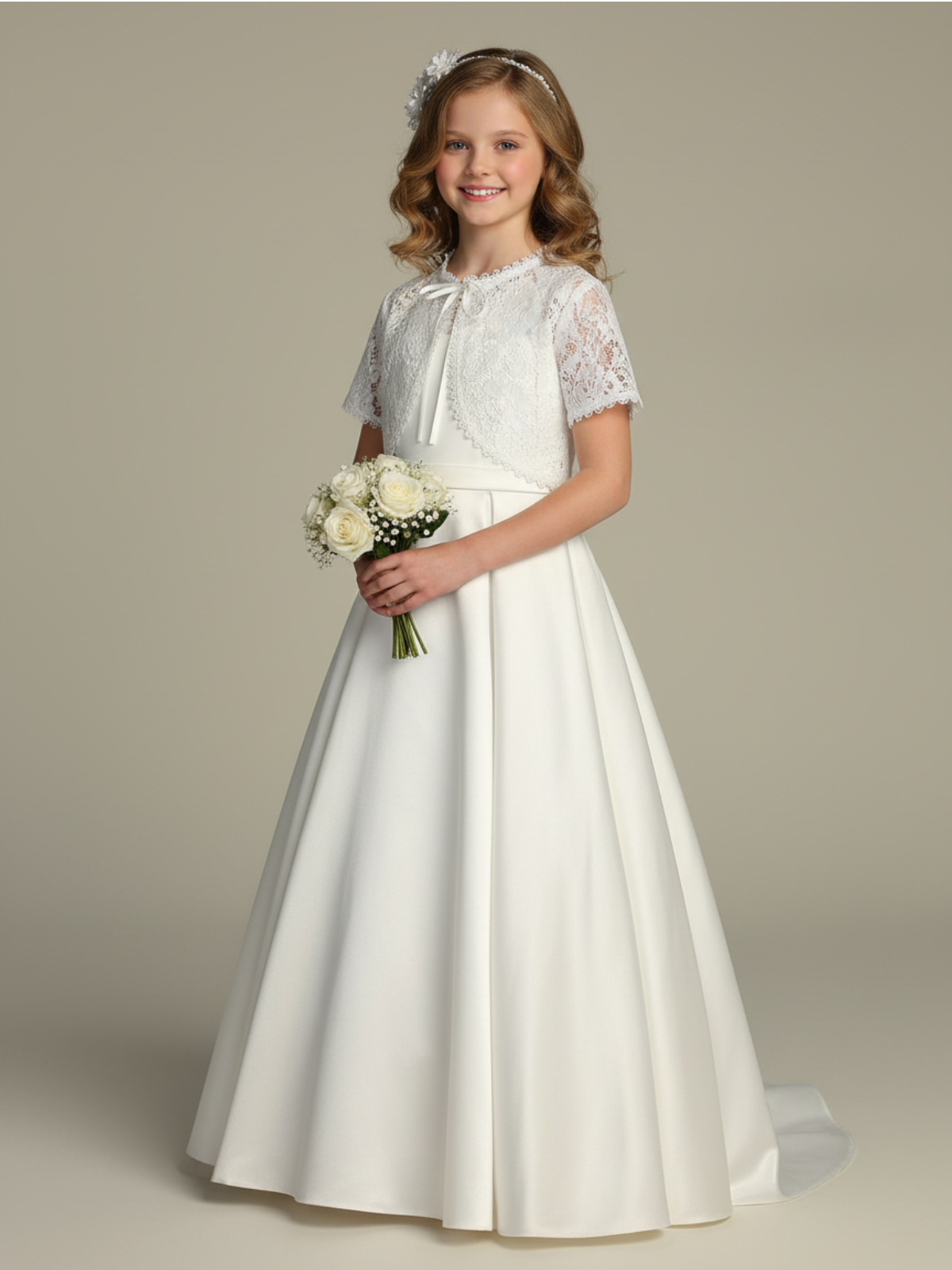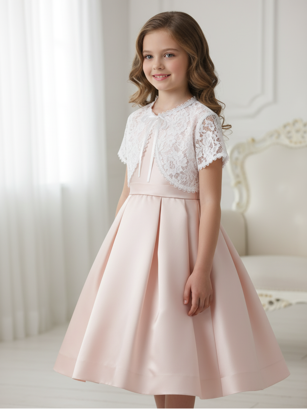 The Serenelle Lace Bolero is a delicate finishing layer designed to elevate any special occasion dress. Crafted from soft floral lace, this short sleeve bolero adds graceful coverage while keeping the look light and elegant. Its scalloped edges and refined silhouette create a timeless complement for communion gowns, flower girl dresses, and formal event wear. Perfect for ceremonies, portraits, and weddings, this lace bolero enhances every outfit with classic charm and subtle sophistication.
