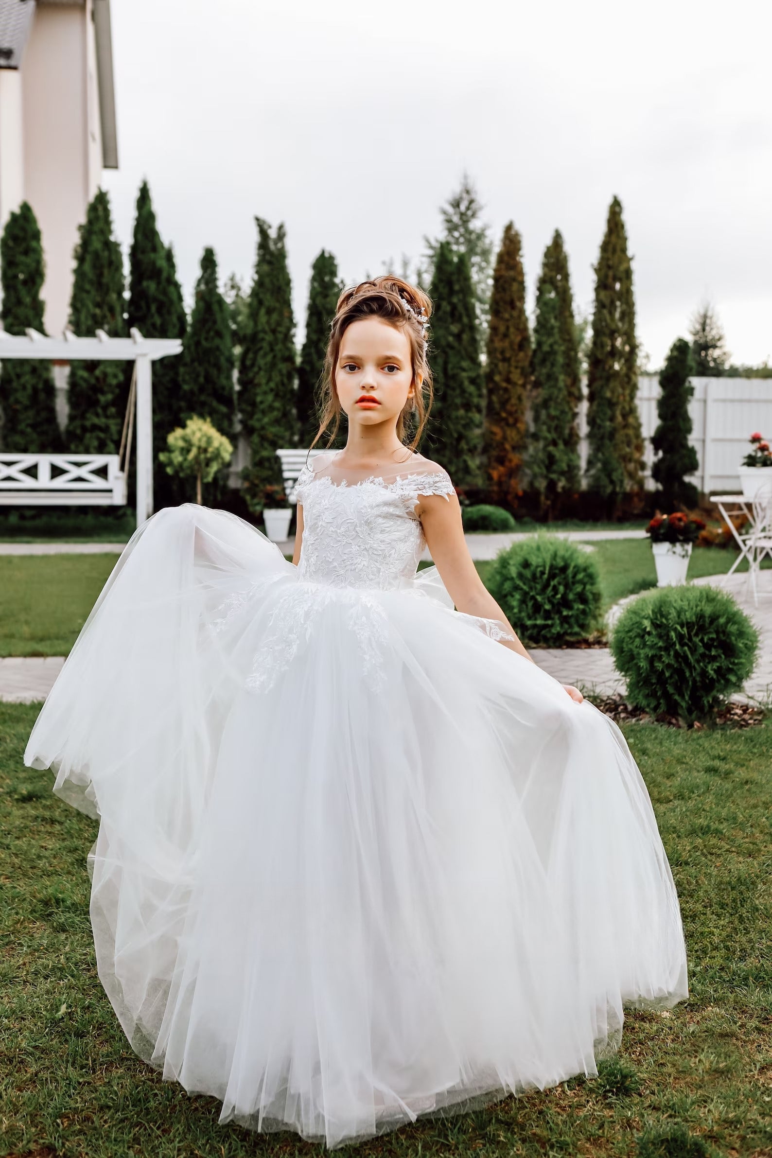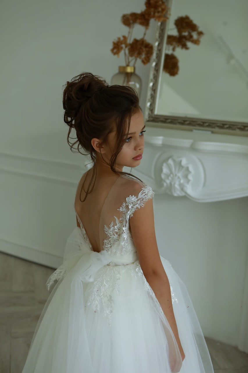 For added drama, a luxurious train can also be included with the dress as shown here on the model, fastening to the waist with buttons. Whether you choose to keep the train attached for a regal entrance or detach it for easy movement, this dress is sure to make your flower girl feel like a star. Perfect for weddings, pageants, or any special occasion where she wants to shine.