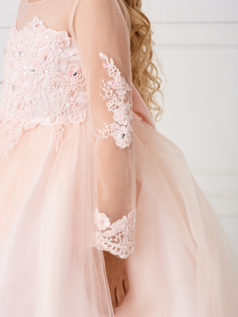 Step into a world of elegance with the Ivy Girls Dress, a masterpiece from Blush Kids Luxury Couture collection that's crafted for the most memorable occasions. This full-length dress features an illusion neckline long sleeve lace bodice that combines both mystery and sophistication, offering a glimpse of skin beneath the intricate lacework. The tulle overlay skirt cascades gracefully, providing a soft and ethereal contrast to the detailed bodice.