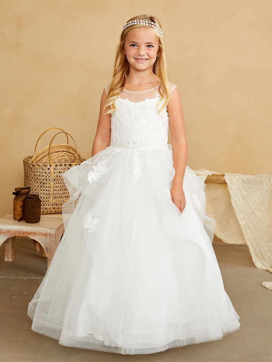 The Harper dress is a dreamy choice for first communions, flower girl roles, and elegant celebrations. Featuring a lace bodice with a sheer scalloped neckline and cap sleeves, this gown exudes timeless charm. The cascading layers of glittering tulle create a voluminous skirt, perfect for twirling and making memories. A delicate satin waistband completes the look, offering a refined and graceful silhouette. The Harper dress is designed to make your little one shine on her special day.