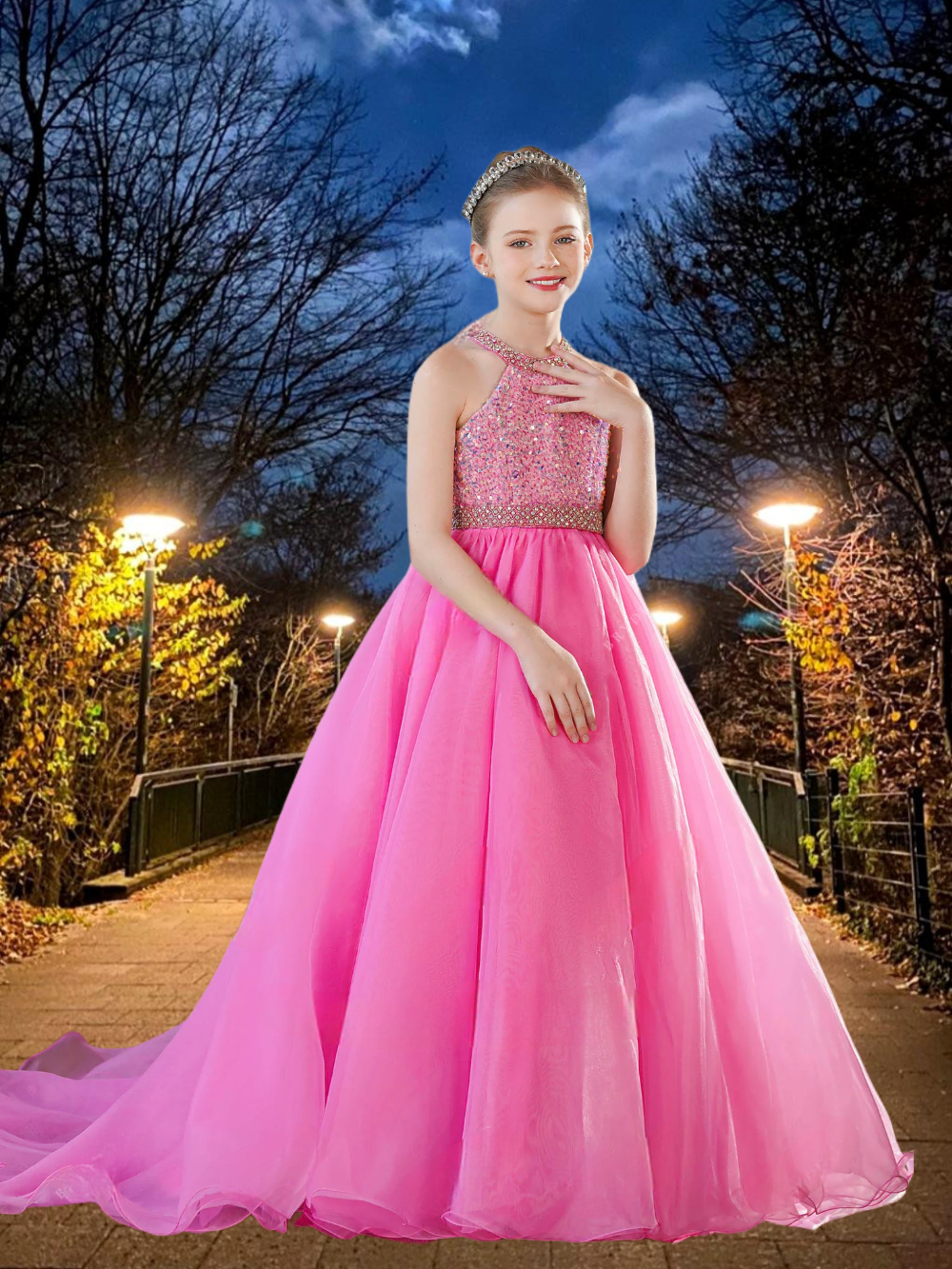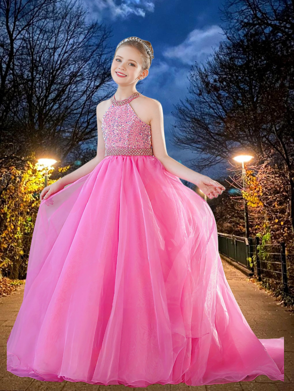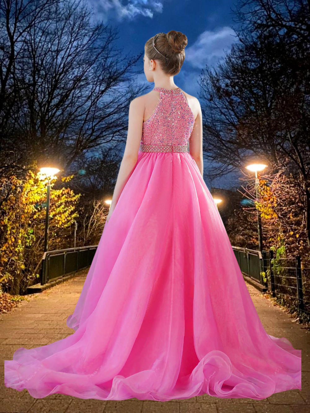 Radiate bold elegance in this striking hot pink Brydealo Couture gown. Featuring a fully embellished halter neckline and waistband, this luxurious ballgown delivers a flawless sparkle for every special moment. The voluminous skirt flows into a sweeping train, perfect for pageants, birthdays, and formal celebrations. Shown in hot pink but available in multiple stunning colors—please refer to our color chart for options. A captivating design made to shine on stage and in every spotlight.