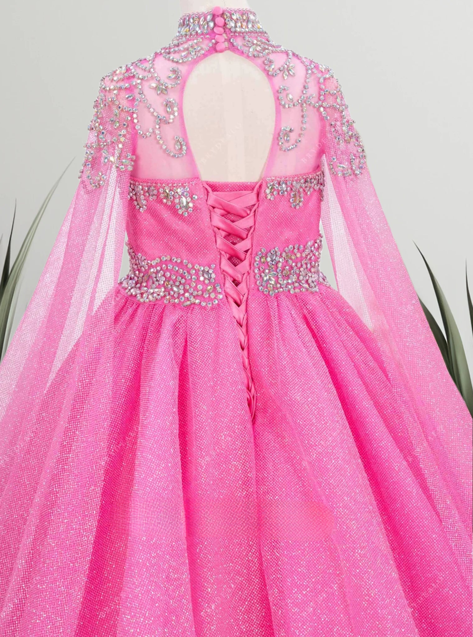 Make a dazzling entrance with the Ailani Radiance Gown from Brydealo Couture. This breathtaking hot pink ball gown features an enchanting high neckline with a sheer illusion yoke, crystal-encrusted bodice, and a dramatic open back framed by sparkling embroidery. The shimmering glitter tulle skirt cascades into a sweeping train with a statement cape for full red carpet impact. Ideal for high-end pageants, stage performances, or birthday portraits, this couture design blends royalty with sparkle. Lace-up back allows for a custom fit.