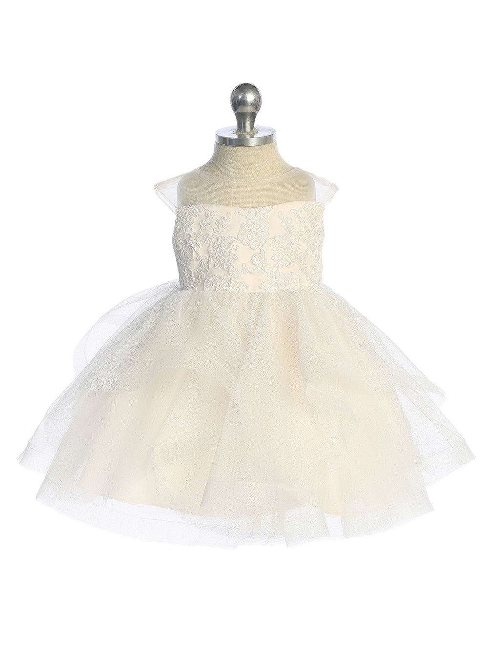 The Isadora Grace Dress is the perfect blend of elegance and innocence, designed to make her feel like a princess on her most cherished day. This charming dress features a delicate lace bodice with floral embroidery, a soft illusion neckline, and cap sleeves for a touch of timeless beauty. The layered glitter tulle skirt creates a full, airy silhouette ideal for twirling. Fully lined for comfort, with a back zipper and tie for a secure, adjustable fit. Ideal for First Communion, flower girl moments, or any special occasion. Available in 3 classic colors.