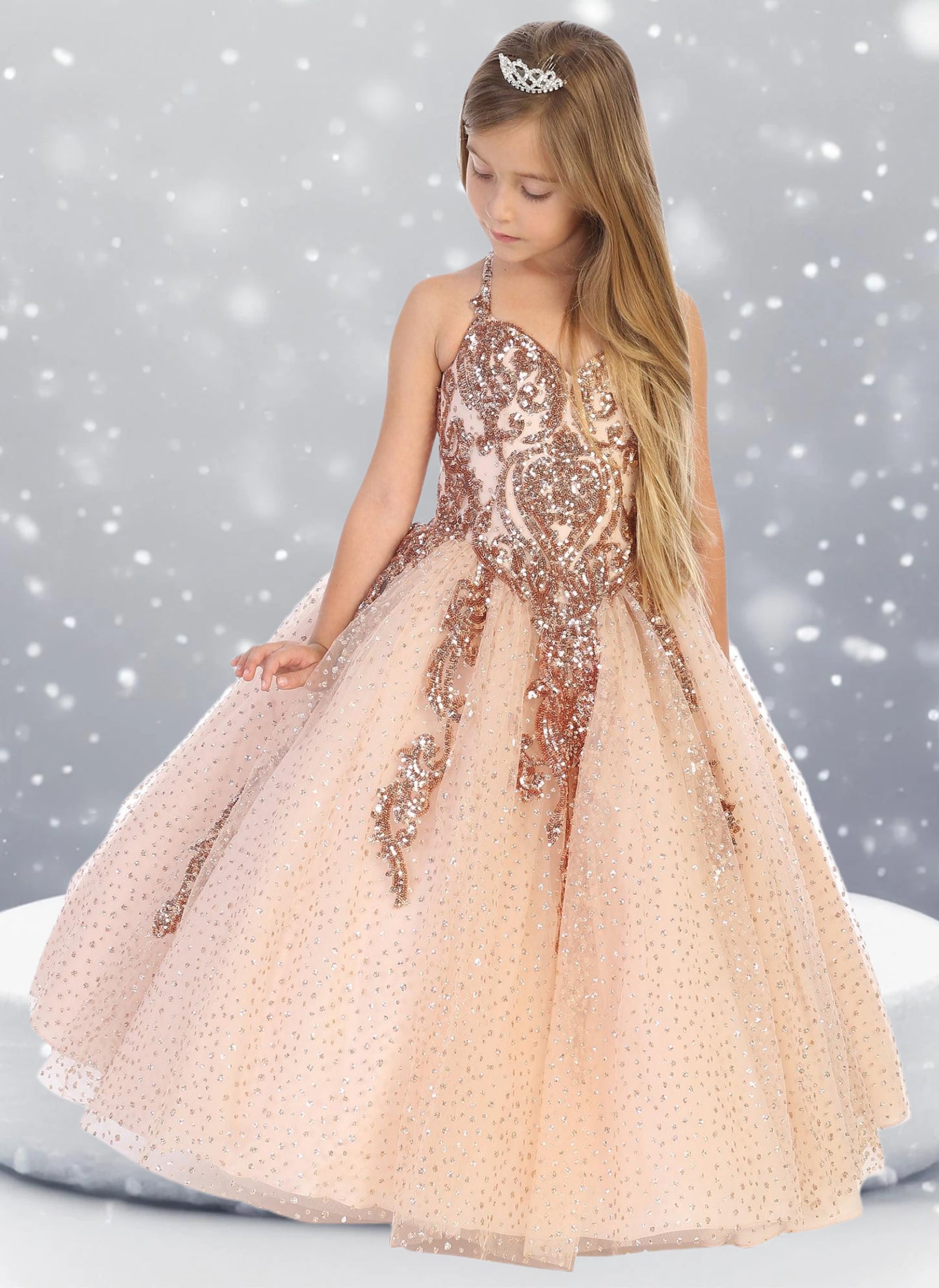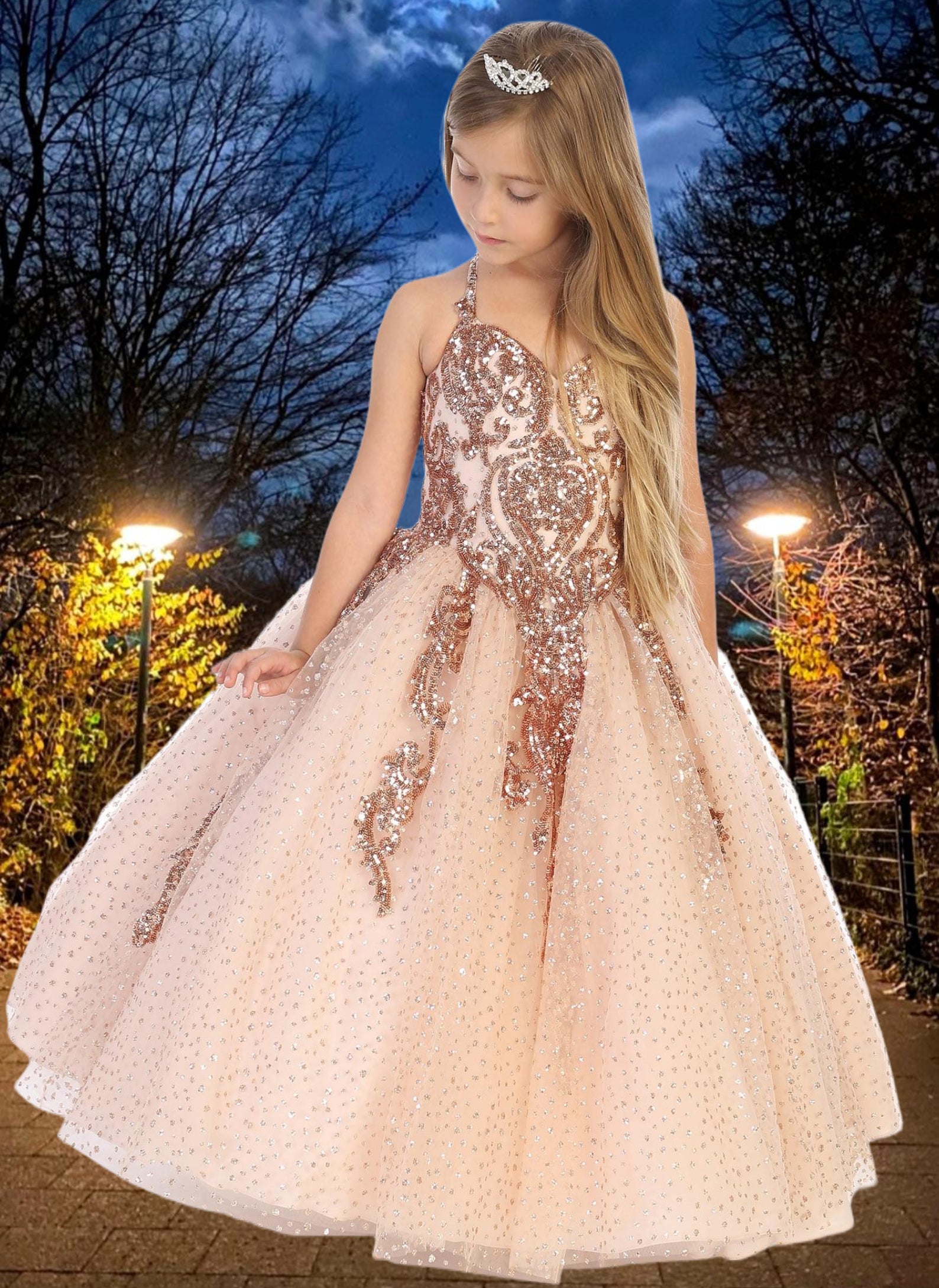 Make a dazzling entrance with the Julianna Gown, a show-stopping design for girls who love all things sparkle and elegance. This peachy-gold ball gown features a fitted sequin bodice with a heart-shaped neckline and radiant halter straps, flowing into a voluminous glitter tulle skirt. The bodice shimmers with ornate rose gold sequin appliqué, cascading into the skirt in dramatic patterns. The back stuns with a sheer cutout and corset lace-up for an elegant fit. Ideal for glitzy pageants, evening events, or special birthdays where your little one deserves the spotlight.