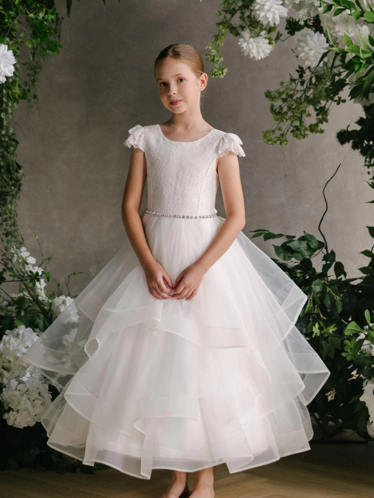 The Julianna dress is a dreamy Teter Warm Couture gown crafted for timeless elegance. Featuring a soft lace bodice with delicate cap sleeves and a flattering V-back, this full-length gown dazzles with its layered tulle skirt and sparkling waistline detail. The floral lace overlay and cascading silhouette make it an enchanting choice for communion, flower girl, and formal occasions. A graceful bow at the back adds a finishing touch of sophistication.