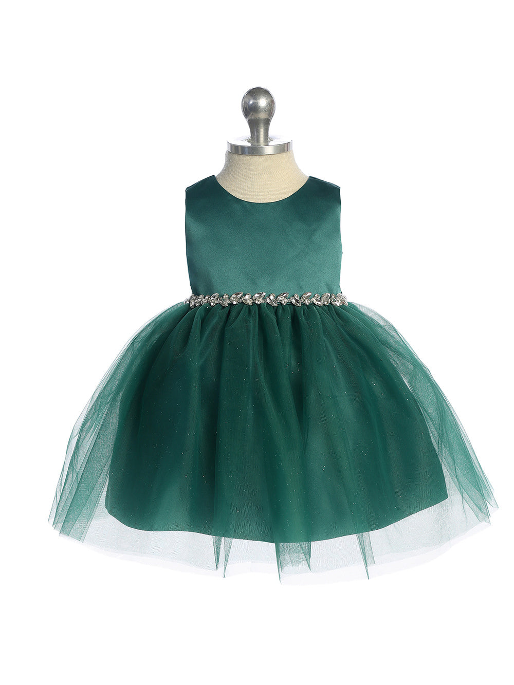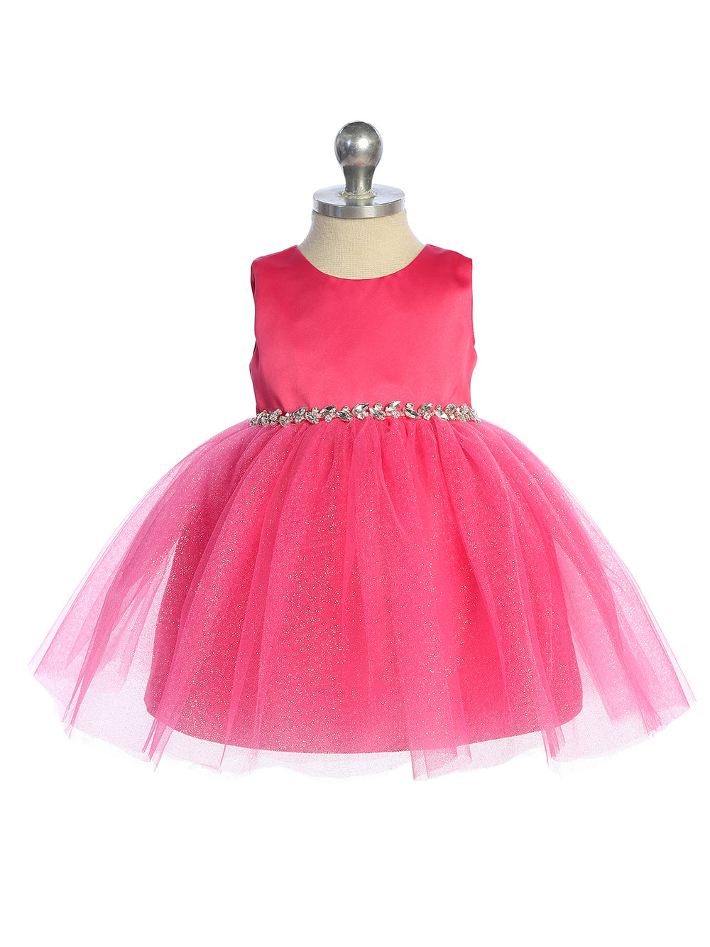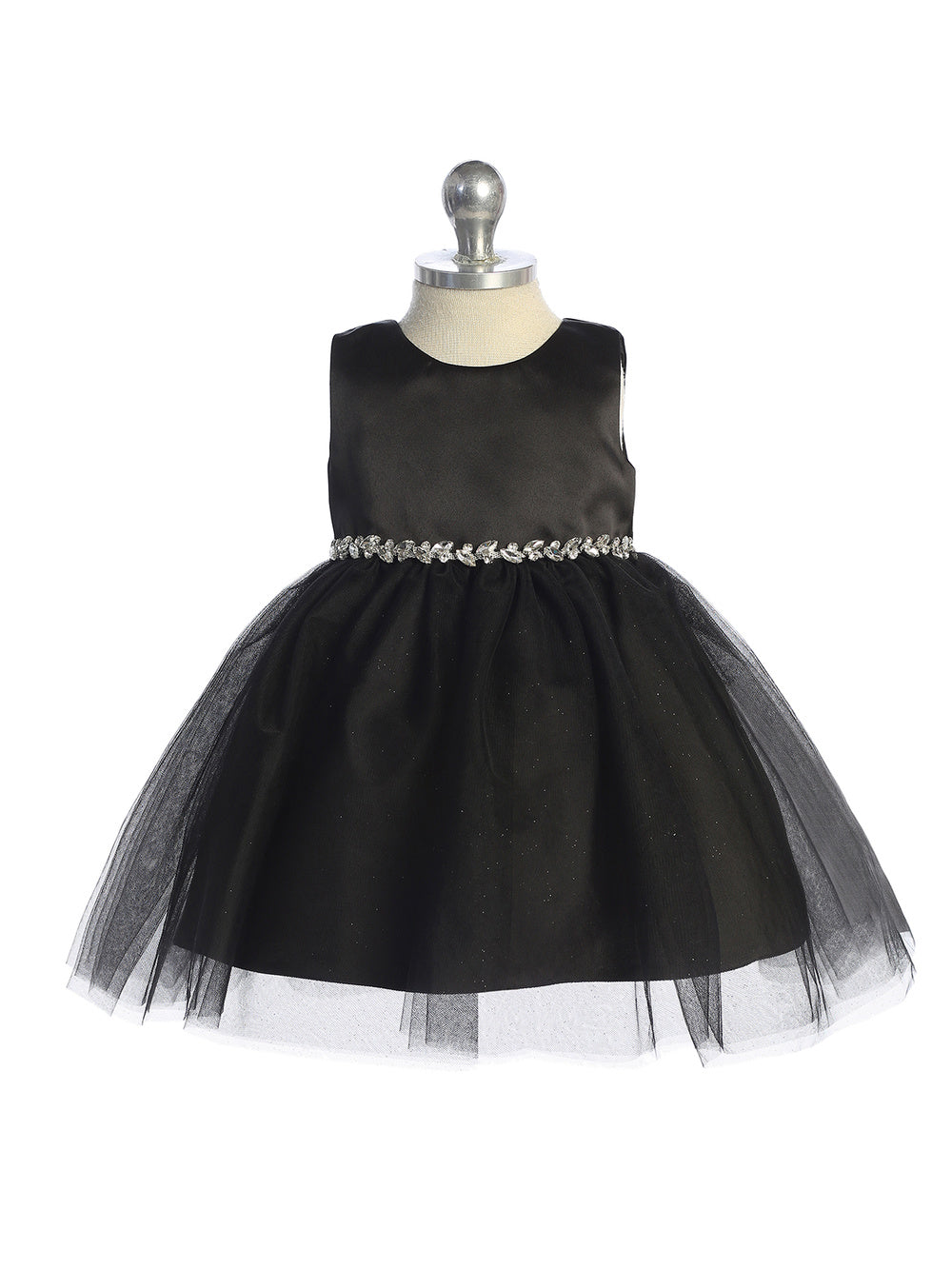 The Juliet Sparkle Baby Dress is designed to make your little one shine on her biggest days. This dazzling dress features a smooth satin bodice and a layered glitter tulle skirt that adds magical movement with every step. A rhinestone leaf belt sparkles at the waist, adding the perfect touch of elegance. Fully lined for comfort, it includes a secure back zipper and ties at the back for a custom fit. Ideal for baby pageants, first birthdays, holiday portraits, and special occasions. Available in 12 beautiful colors to match every moment.