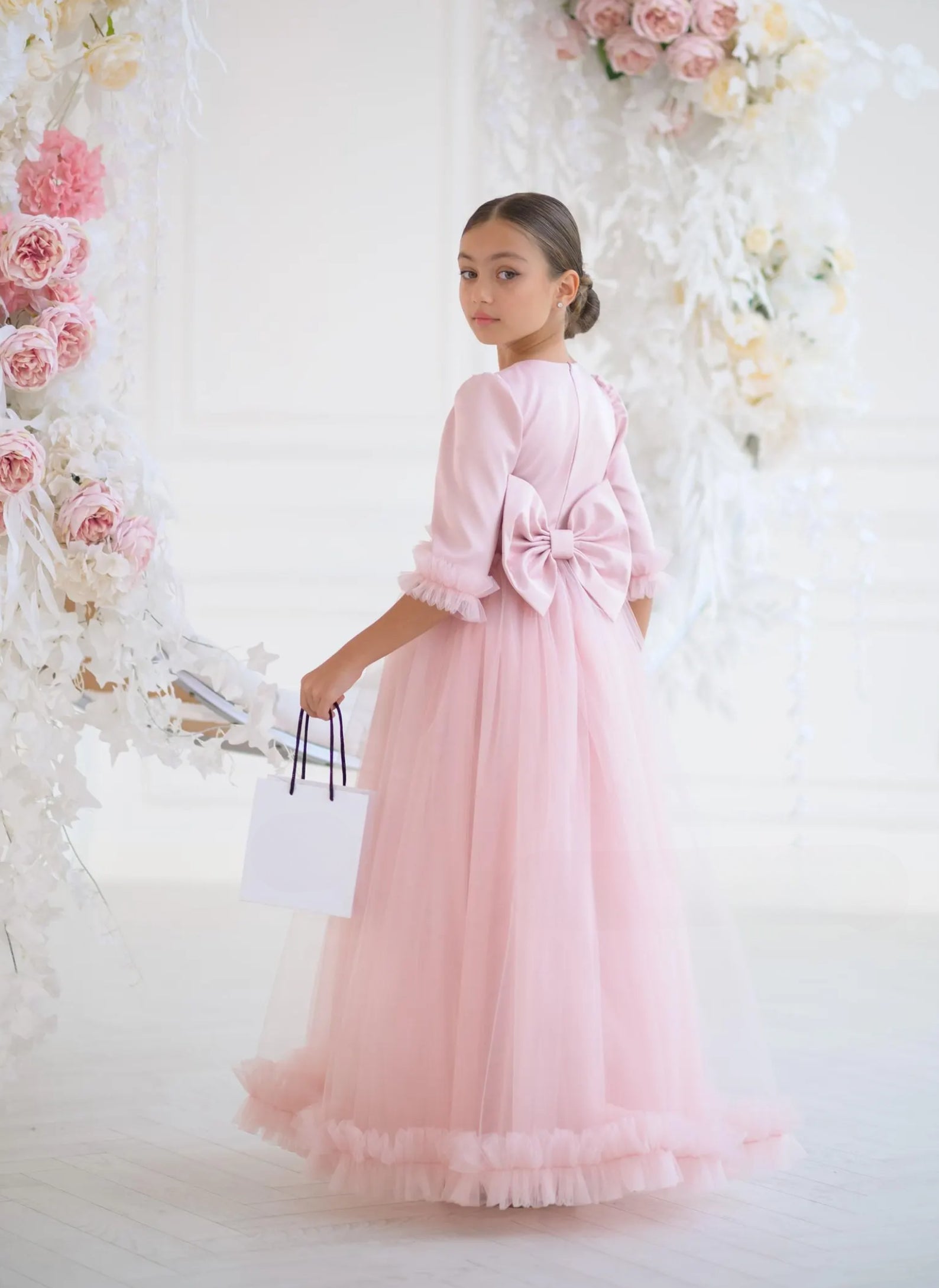 Let her shine in the Julietta Blush Couture Gown, a breathtaking pink tulle dress designed for unforgettable entrances. This luxurious gown features a satin bodice, romantic sheer sleeves, and a full layered tulle skirt finished with delicate ruffled trim. The show-stopping oversized bow at the back adds couture drama and sweetness. Perfect for birthdays, pageants, flower girl moments, or any special occasion, Julietta is meticulously handmade with soft, non-irritating materials for all-day comfort and elegant flair.