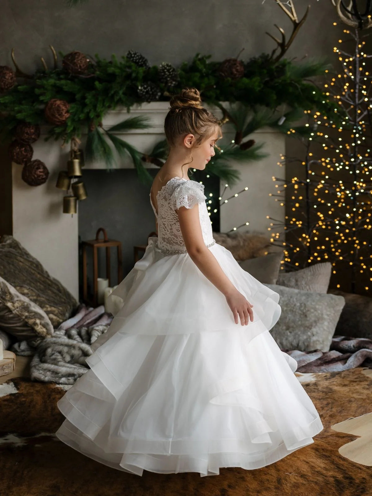 The Julissa Gown by Teter Warm Couture is a romantic blend of tradition and charm, perfect for first communions, flower girl duties, and formal celebrations. This enchanting white dress features a delicately embroidered lace bodice with flutter cap sleeves, a soft scoop neckline, and a dazzling rhinestone waistband. Layers of flowing tiered tulle create a full ballgown skirt with soft volume and graceful movement. The open V-back, finished with a satin bow and crystal buttons, adds an elegant final touch. A timeless choice for girls seeking elegance and sparkle for their special day.