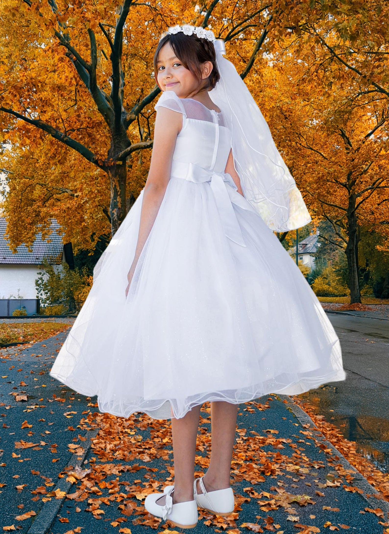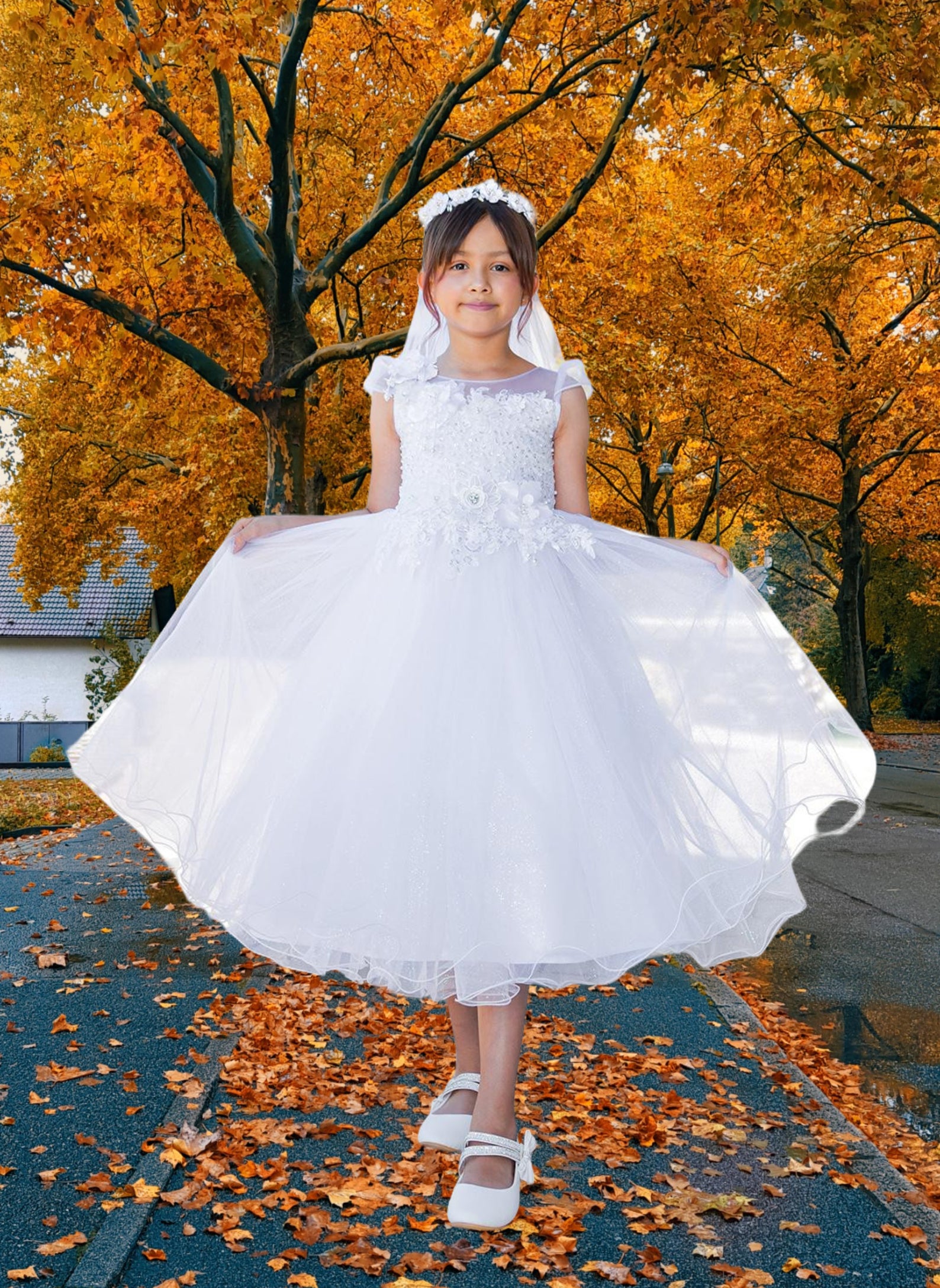 A vision of timeless charm, the Julissa Dress features a tea-length silhouette adorned with shimmering layers of tulle and delicate floral lace embroidery. The bodice sparkles with floral appliqués and pearls, while a soft satin bow ties at the back for a sweet finish. Cap sleeves and a sheer illusion neckline complete the look, making this dress perfect for 1st communion, flower girl duties, or any elegant special occasion.