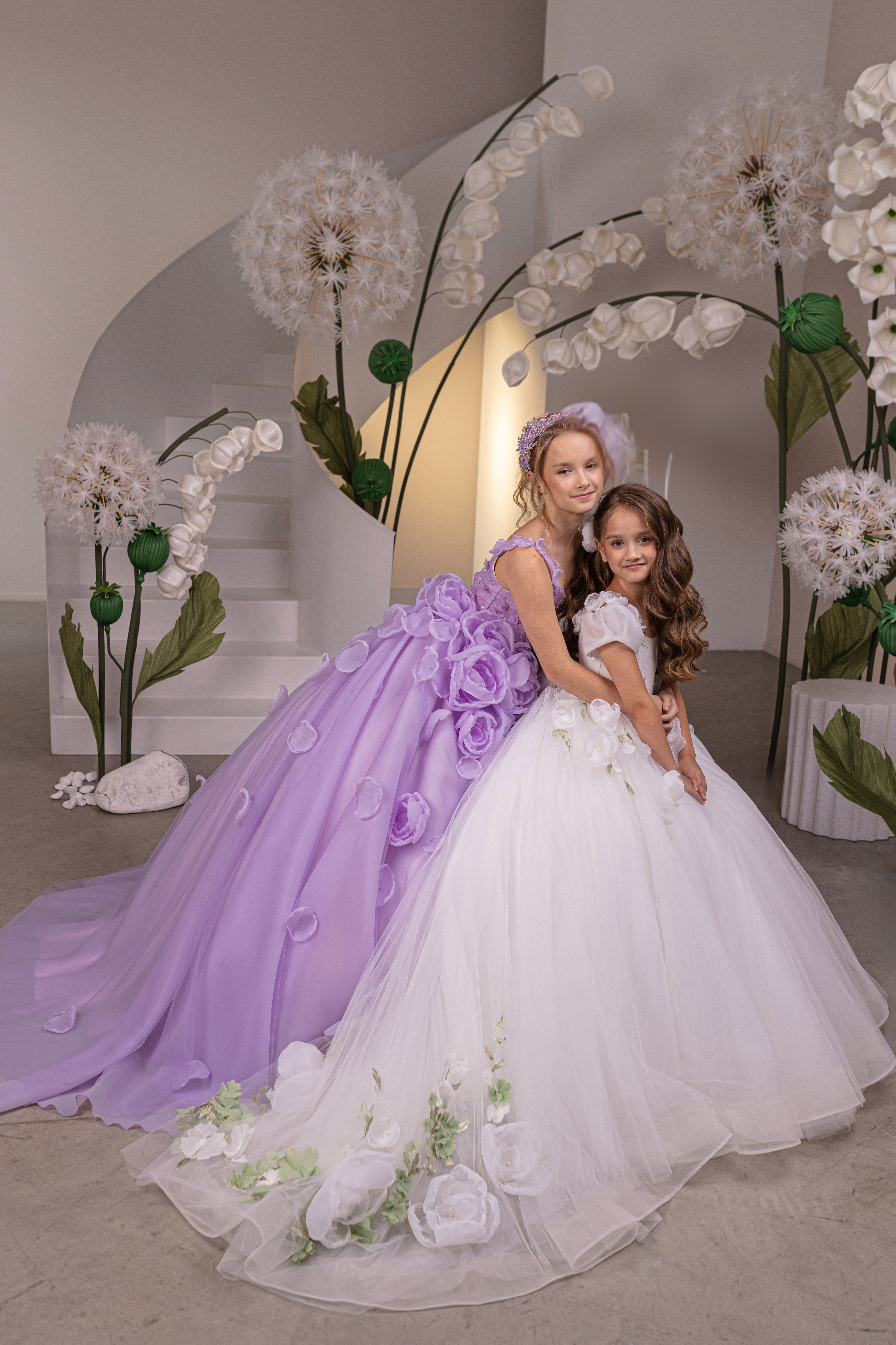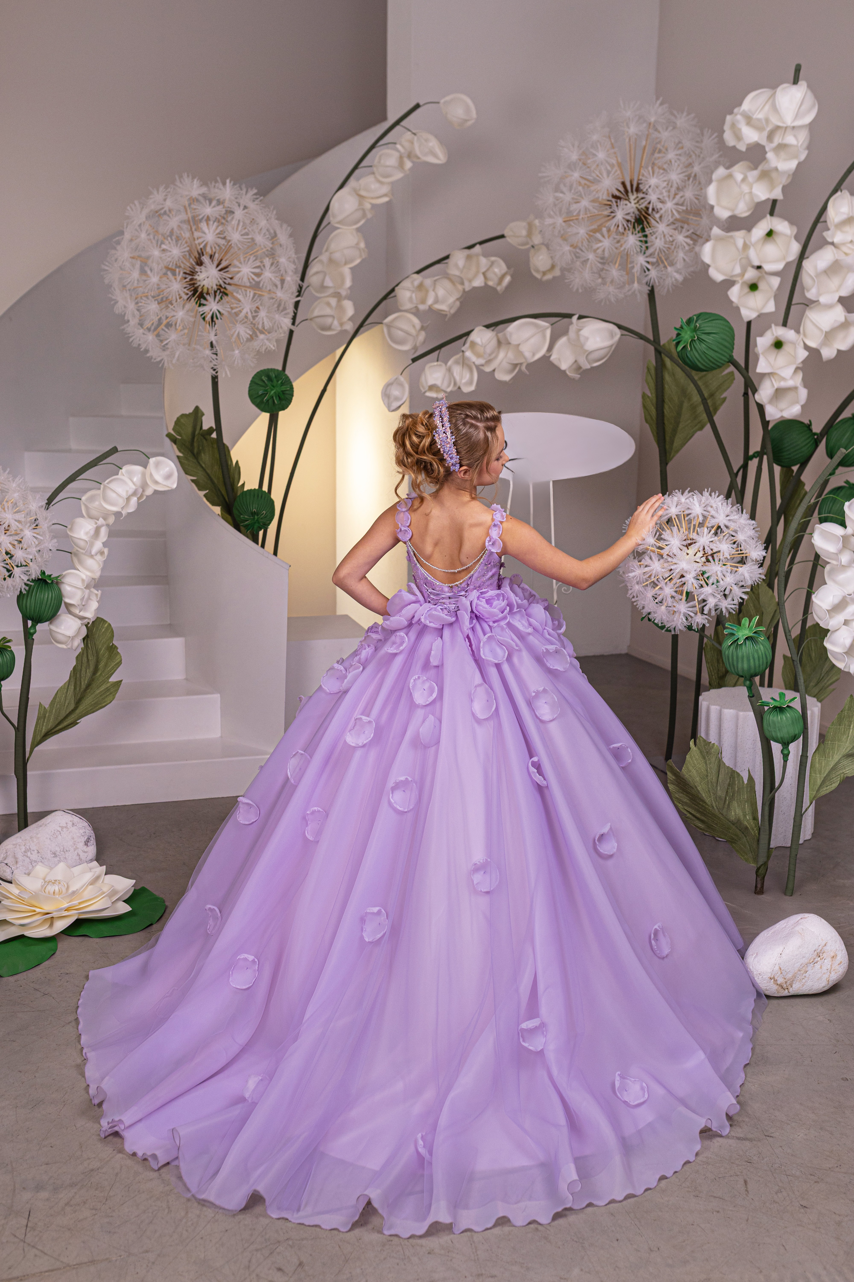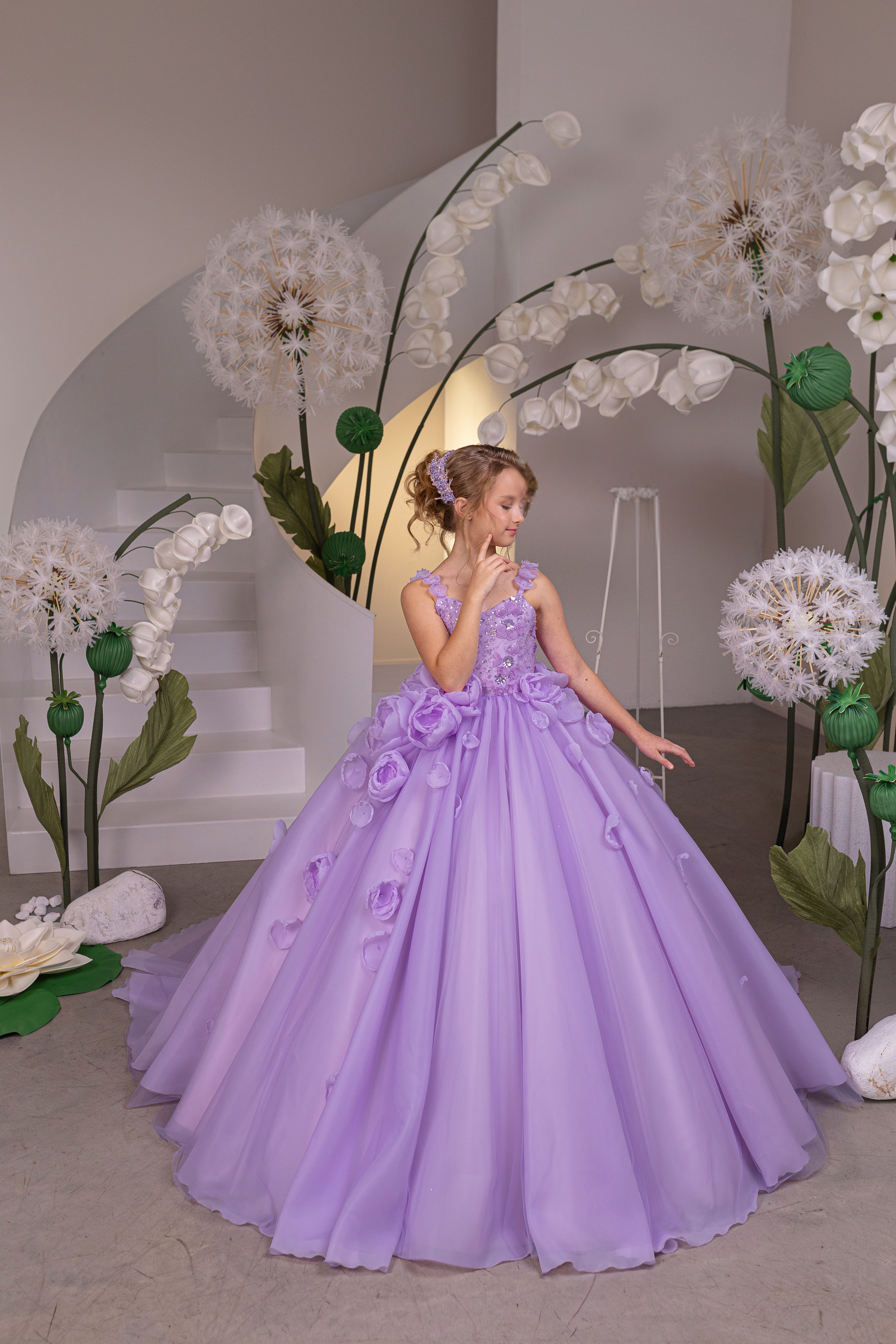 The Lavendelle Royale Gown is a breathtaking couture masterpiece designed for girls who command the spotlight. Shown here in an enchanting lilac hue, this high-end ball gown features a flawlessly structured bodice adorned with delicate floral appliqué, subtle shimmer detailing, and refined hand-finished accents that elevate its couture presence. Soft sculpted straps frame the shoulders gracefully, while the voluminous tulle skirt cascades into a dramatic silhouette embellished with dimensional floral petals for a truly romantic finish. The corset-style lace-up back ensures a custom, elegant fit, complemented by an airy fullness that moves beautifully with every step. This gown is a true statement of luxury, artistry, and refined design. Perfect for pageants, luxury birthdays, formal portraits, galas, father-daughter dances, and unforgettable special occasions, the Lavendelle Royale Gown is crafted for families seeking exclusivity and couture-level craftsmanship. Available in eight stunning color options, allowing every young girl to express her own fairytale moment.
