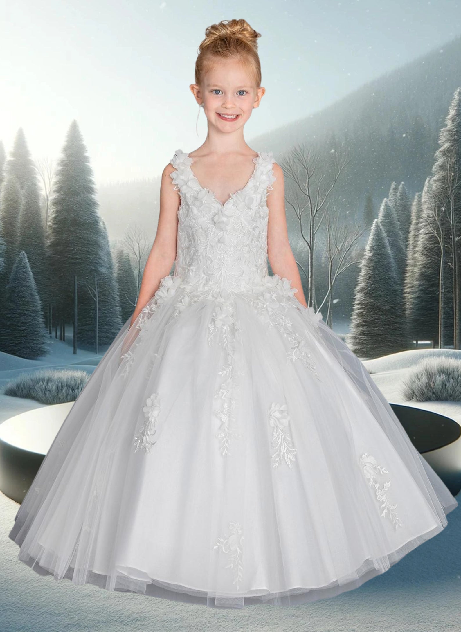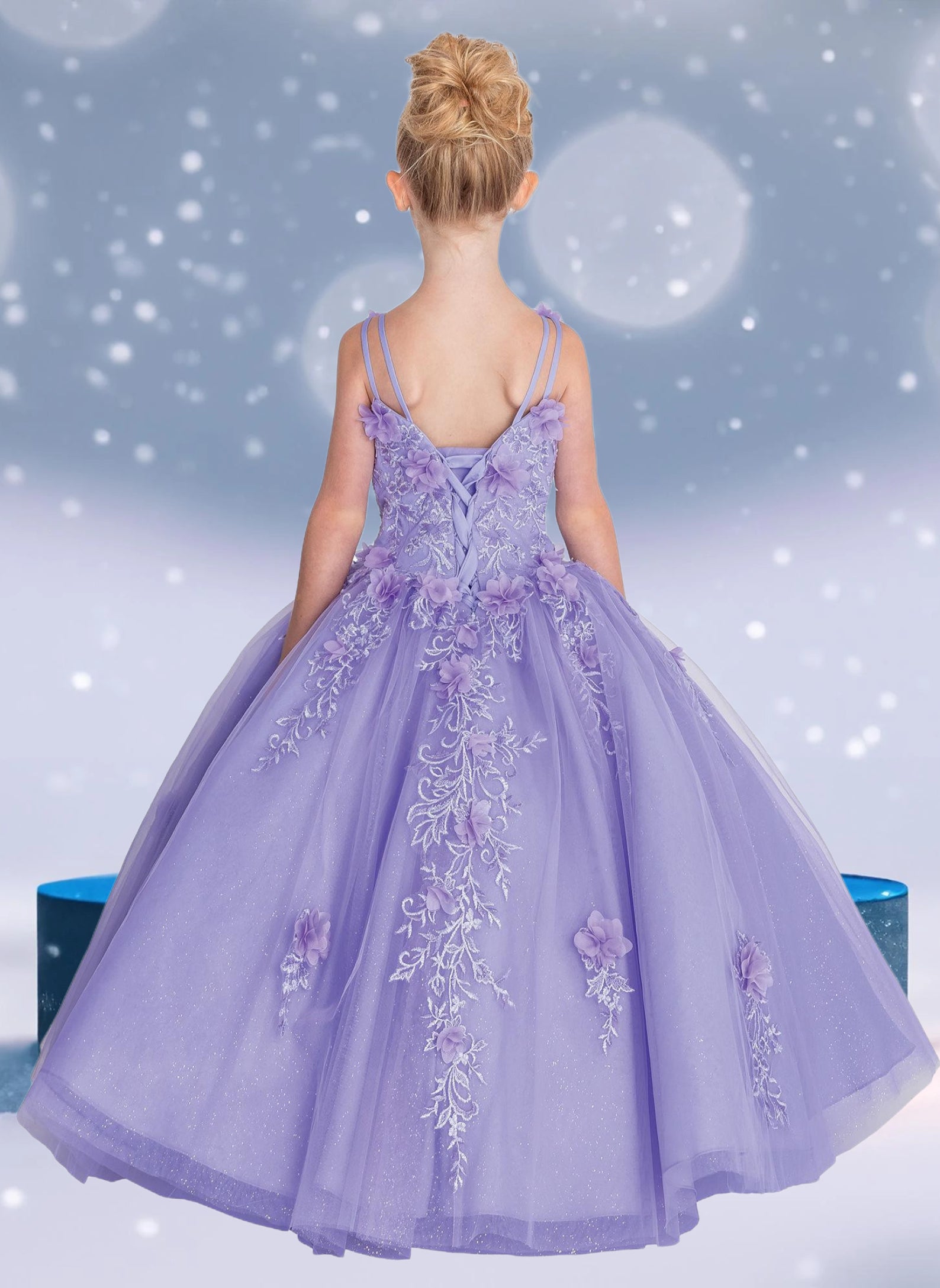 Make her special day shine in the enchanting Lilac Florabelle Gown. This sparkling pageant dress features a soft lilac hue, elegant double shoulder straps, and a V neckline adorned with 3D floral appliqué. The full tulle skirt shimmers with glitter and cascading floral embroidery, creating a dreamy, twirl-worthy silhouette. Finished with a lace-up back for an adjustable fit, this dress is perfect for pageants, first communion, birthdays, or any elegant celebration where she deserves to feel like royalty.