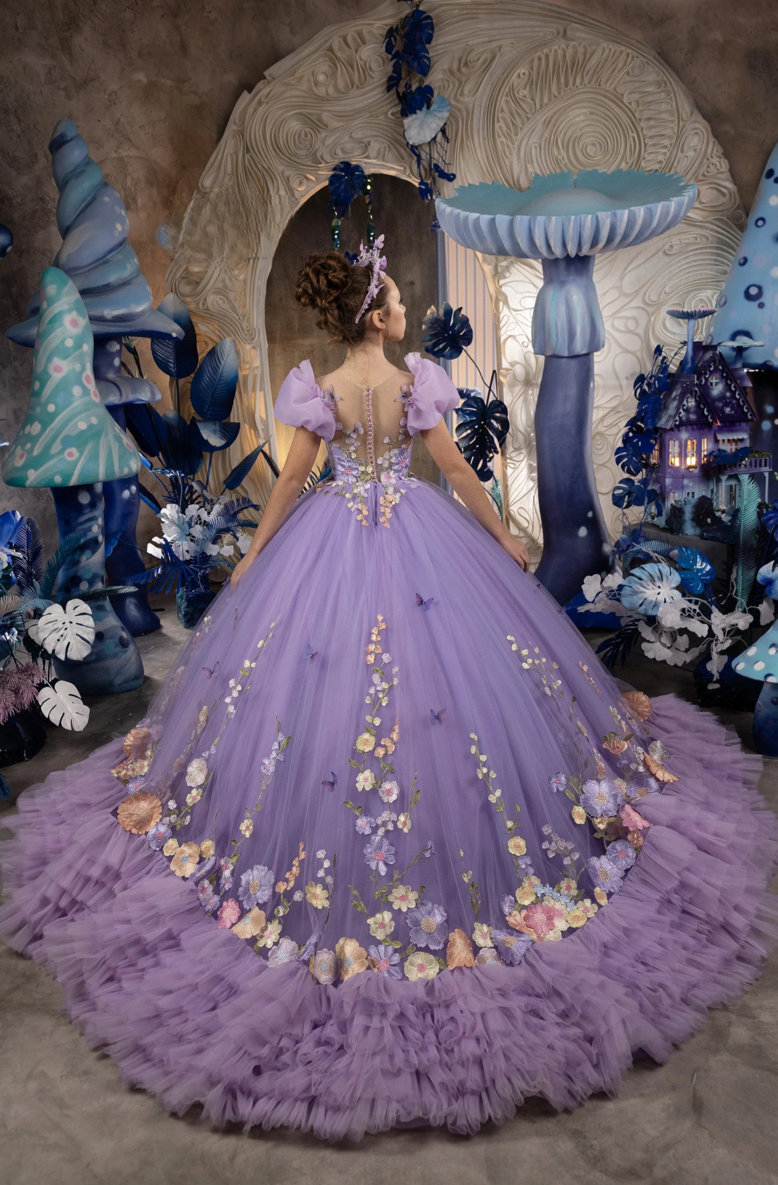 This breathtaking lavender couture gown is a true work of wearable art, designed for girls who deserve an unforgettable entrance. Crafted for the highest level of elegance, this high-end fashion couture piece features a voluminous tulle ballgown silhouette adorned with intricate floral embroidery that cascades gracefully from bodice to hem. Delicate puff sleeves add a soft, romantic touch, while the illusion back with pearl button detailing creates a striking couture finish. The sweeping skirt is layered with airy tulle and finished with a ruffled hem, giving the gown dramatic movement and a regal presence perfect for pageant stages, flower girl moments, and luxury special occasions. Every detail reflects refined craftsmanship and couture-level design, making this gown ideal for parents seeking a statement piece that blends fantasy, elegance, and timeless beauty. Perfect for flower girl ceremonies, pageants, formal events, portraits, and once-in-a-lifetime celebrations, this gown is designed to captivate from every angle.
